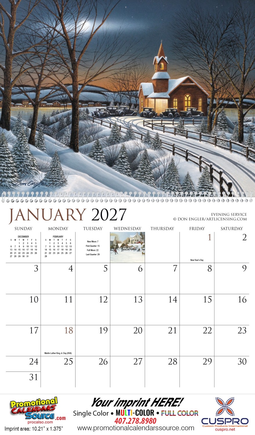 Back Home Promotional Calendar - Spiral. The values of yesterday and a simpler time are captured in these thirteen paintings. The images evoke pleasant memories from "back home" in wonderful color and detail. Spiral Bound calendar. Custom printed with your information will provide year long advertising.