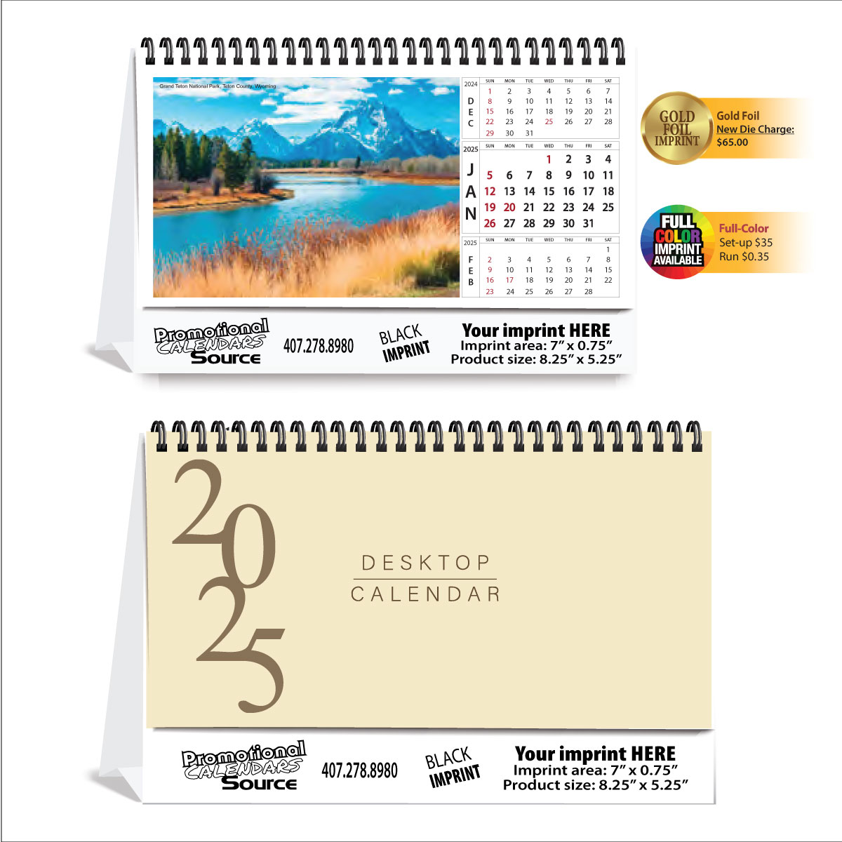 Item JC-712 is a Tent Desk Calendar decorated with SCENIC images of AMERICA landscapes. Stand Construction made of 15 pt. Gloss Cover stock, and pages made of 8 pt. Gloss Cover stock.