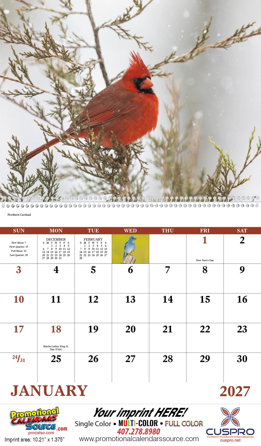 For bird lovers and aficionados, this 13 month calendar features a variety of colorfull birds form North America. Customized with your business information, will bring joy and colors from nature to every recepient.