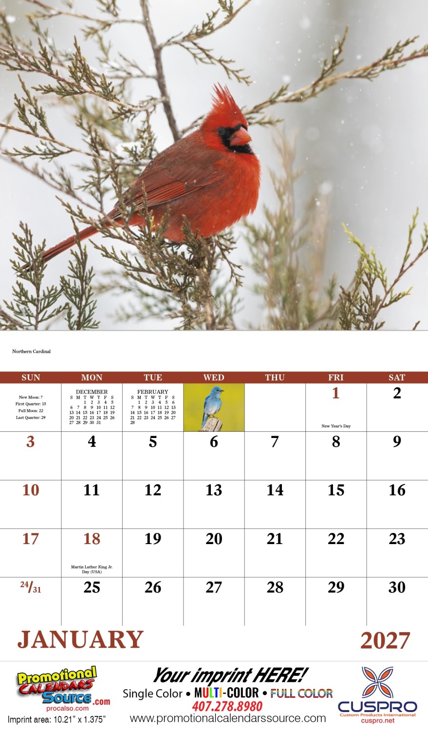 For bird lovers and aficionados, this 13 month calendar features a variety of colorful birds form North America. Customized with your business information, will bring joy and colors from nature to every recepient.