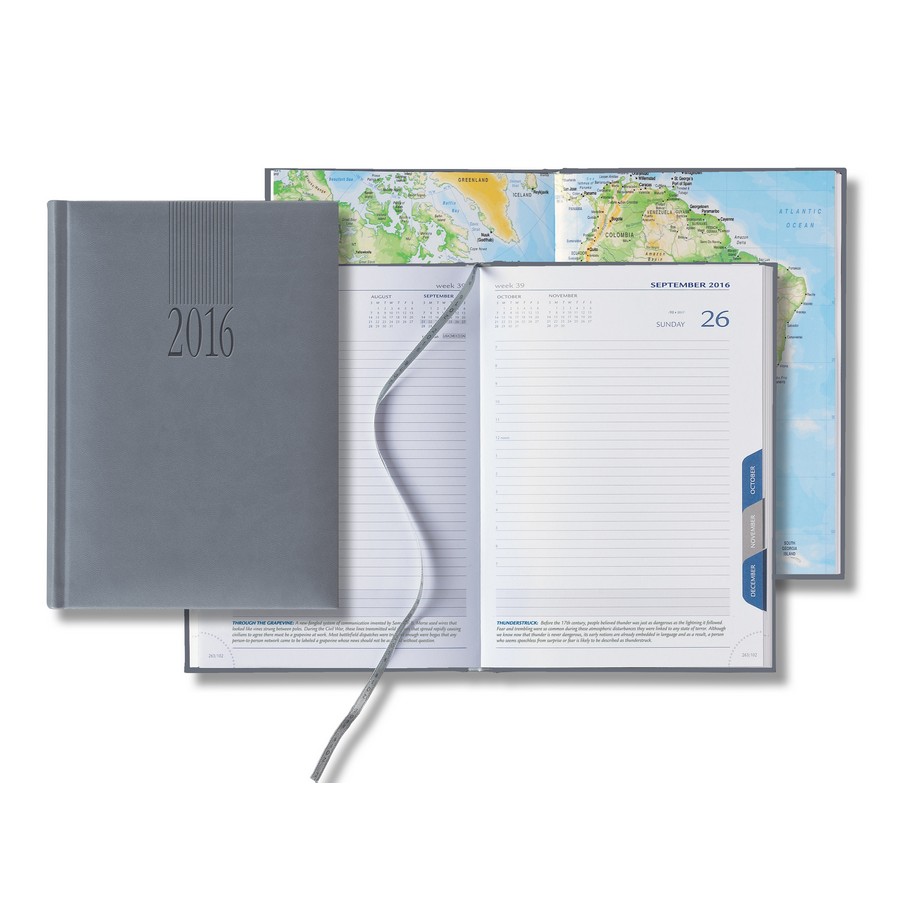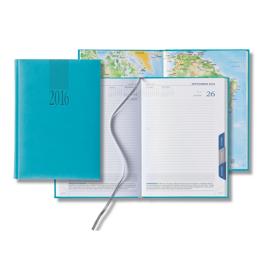 The Castelli Tabbed Mid Size Daily Includes: 416 white lined pages with time reference in modern blue and gray print. A tab separates each month where each page includes perforated corners, a month at a glance in three month sections. A silver ribbon marker with printed year date and an extensive reference section in the back that includes National and International Holidays, maps, exchange tables, and important reference lists. Our most popular cover, Tucson is a smooth soft texture that is often mistaken for leather.