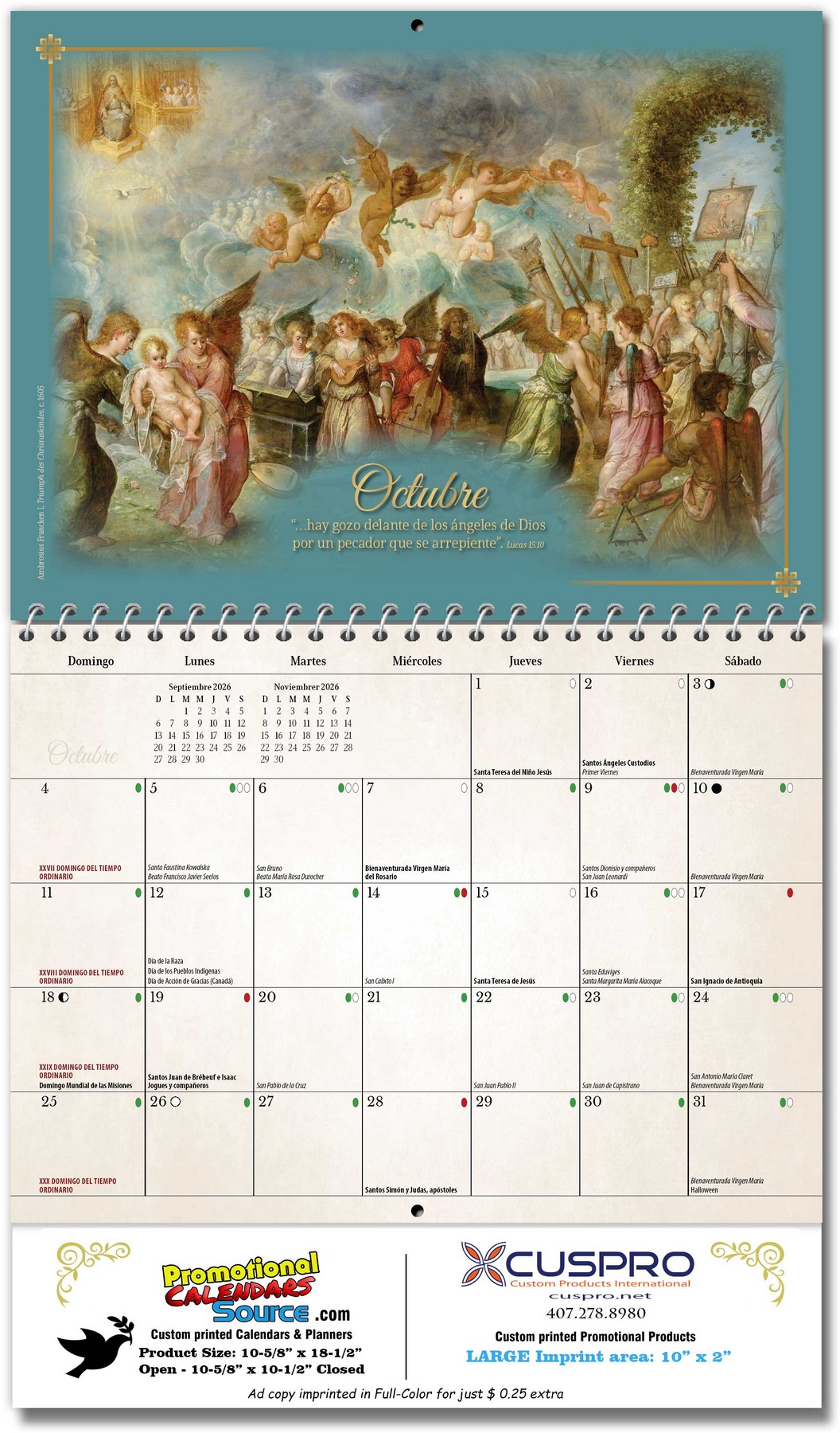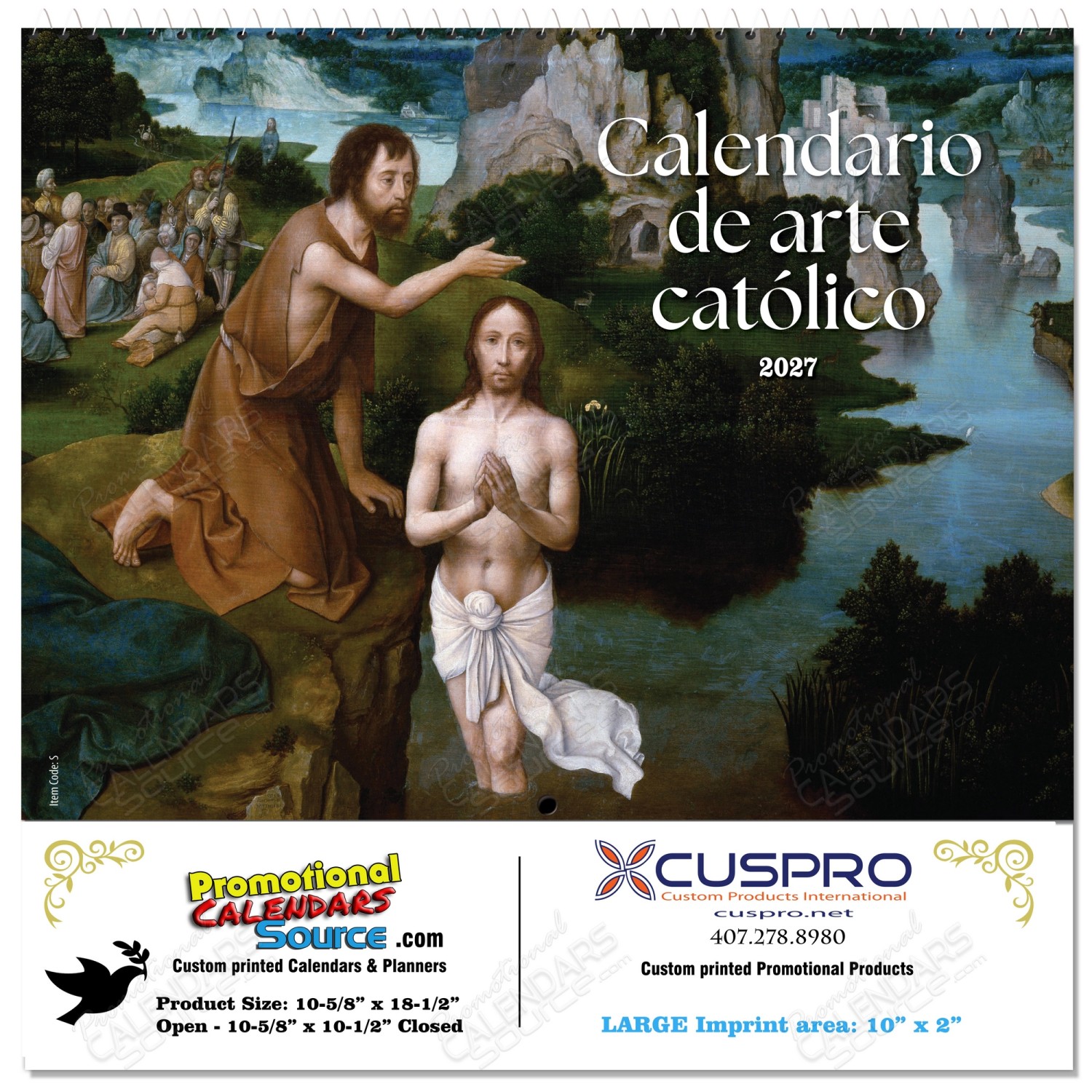 Catholic Art Calendar in Spanish Espanol, tells the story of God’s saving relationship with us through stunningly beautiful images. The 2027 version of this perennial best seller draws people into a deeper relationship with Christ by presenting key moments of His life in monthly images that arouse both wonder and worship. If a picture is worth a thousand words, each monthly image of this calendar proclaims a thousand Catholic teachings. This calendar is, thus, a feast for the eyes and a teaching for the soul. Color-Coded Vestments are printed on the monthly grids. This calendar may be referenced time and again for inspiration and quiet contemplation.