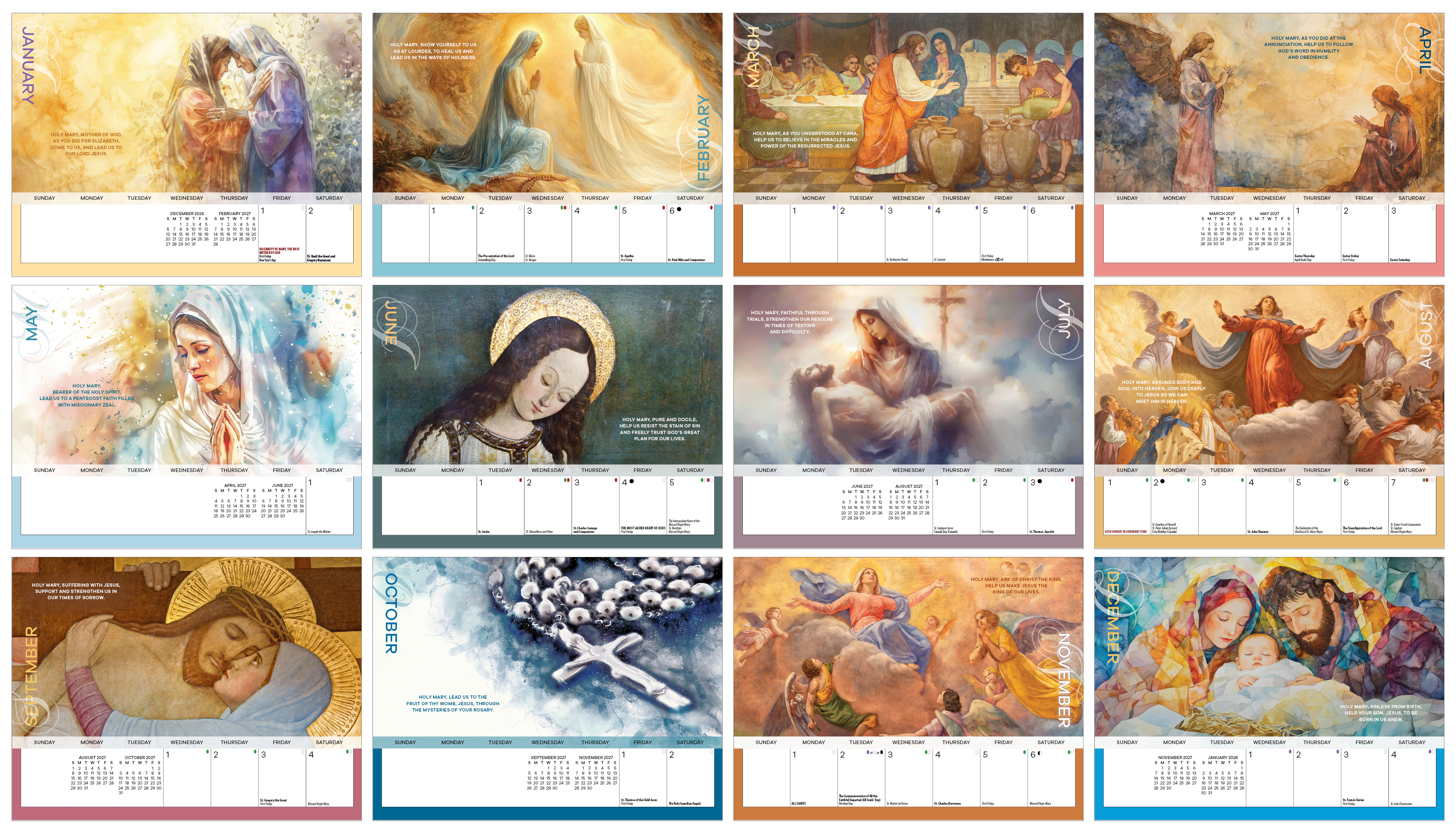 We believe in the Communion of Saints. We believe that, even now, we participate in a dynamic and living spiritual union with Christ and the Holy Saints in Heaven. The 2027 Catholic Evangelization Calendar helps Catholics participate in this powerful communion by introducing a different saint each month. Through captivating images and brief biographies, each saint is presented to help Catholics call upon that saint in prayer. The saint is implored to intercede for us, and the spiritual power of the Communion of Saints is understood and unleashed.