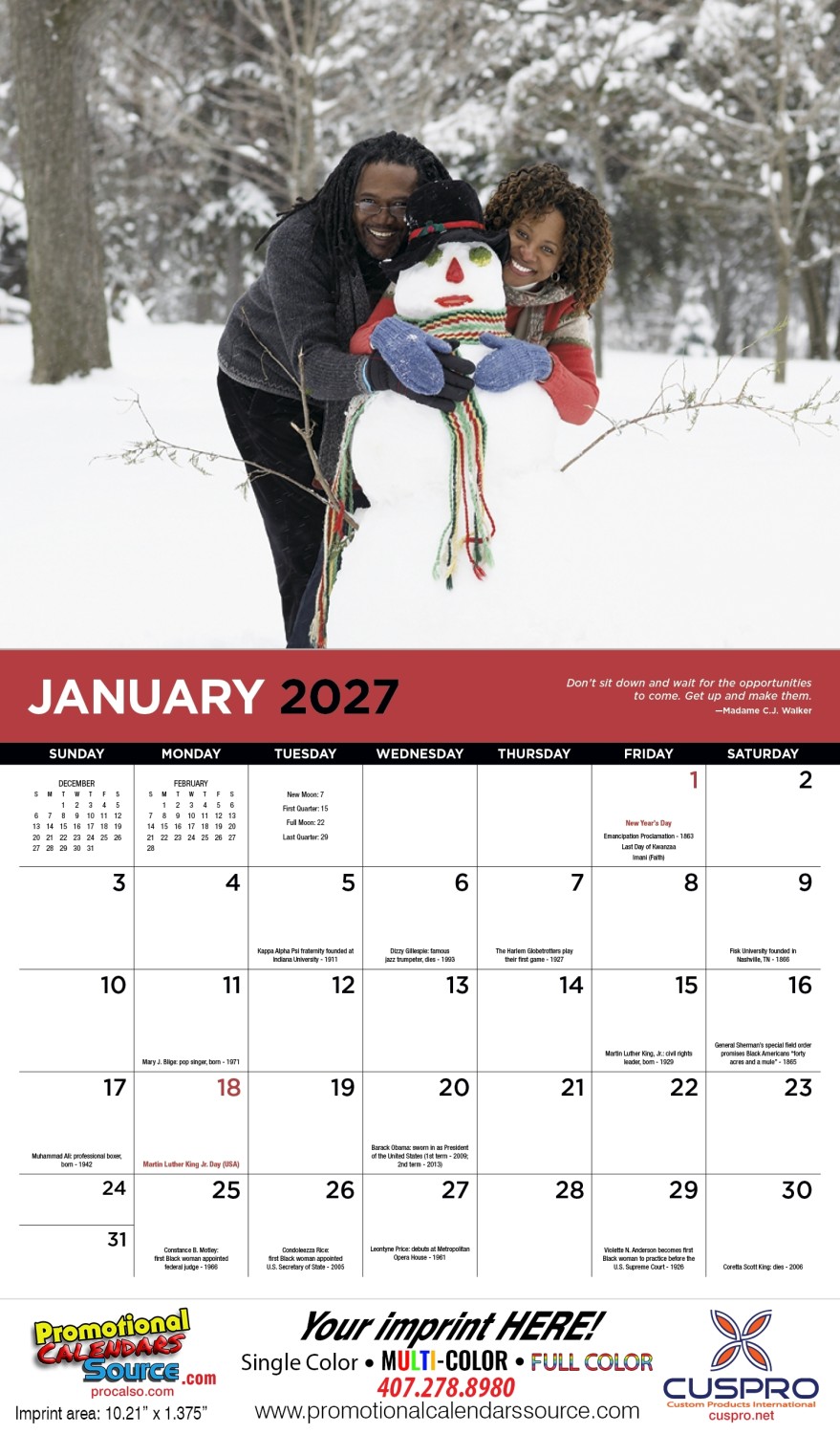 A Celebration of Culture Promotional Calendar with Stapled binding. Celebrate the accomplishments of African Americans through colorful photos of contemporary life and culture. Each day highlights an event or person important in African Americans proud history and heritage. Includes an inspirational quote each month. Custom printed with your information will provide year long advertising.