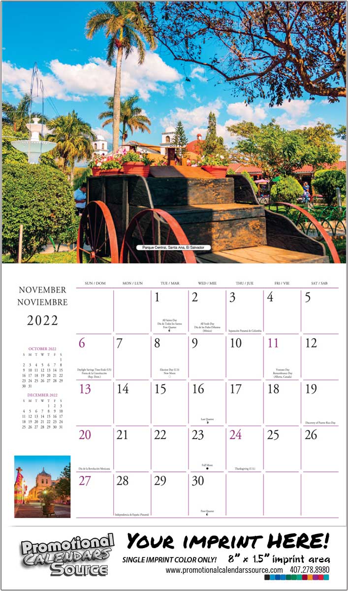 A Bilingual Spanish-English promotional calendar of central america. Custom printed calendar with central america images, for business advertising.