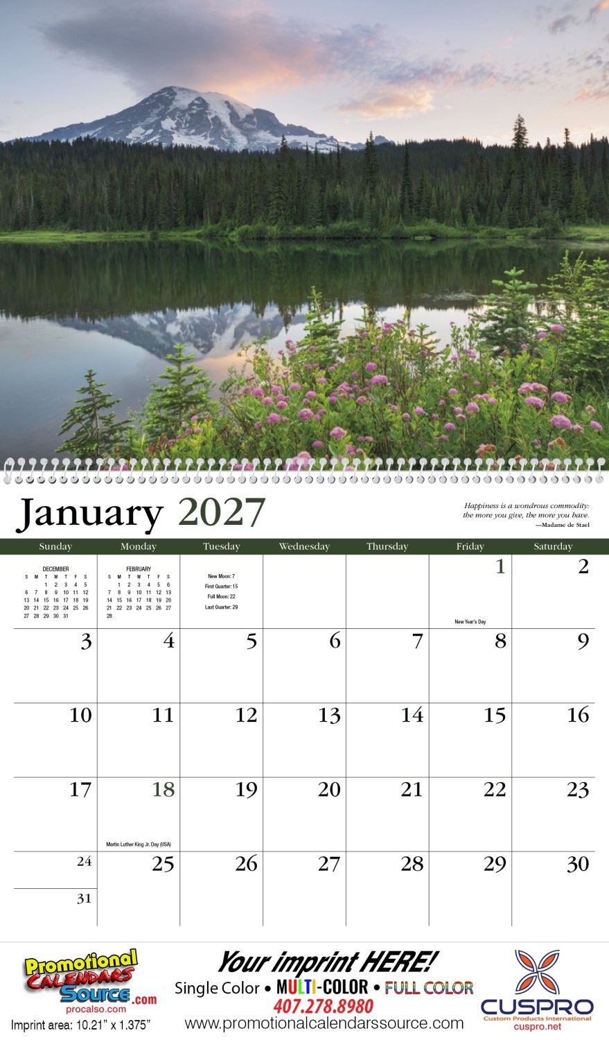 Contemplations Wall Calendar - Spiral. Thirteen serene images are sure to help soothe your senses while contemplating the inspirational quote accompanying each image. Spiral Bound calendar. Custom printed with your information will provide year long advertising.