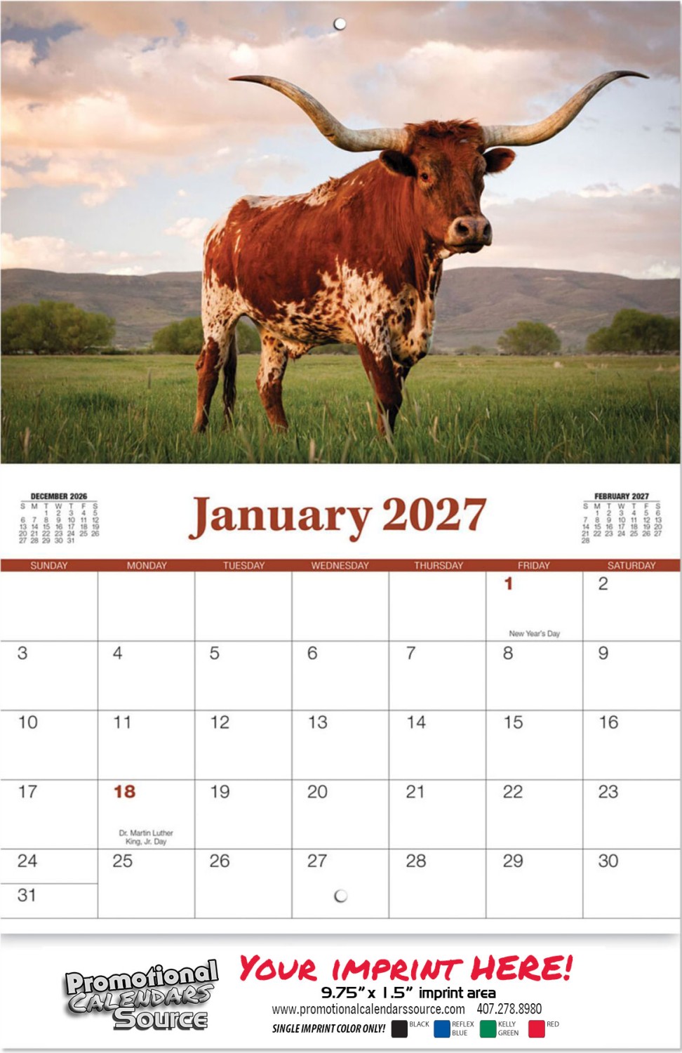 Country Memories Wall Calendar with pages saddle stitched. Agricultural themed calendar with Classic paintings of American farm scenery on a 13 month wall calendar with stitched binding featuring high quality photos. Seasonal scenes of the american farmland, this is a beautiful calendar to be customized for your all year adverting . Custom printed on the bottom flap in single or multi-color imprint. 2023 Custom Printed Promotional Wall Calendar.