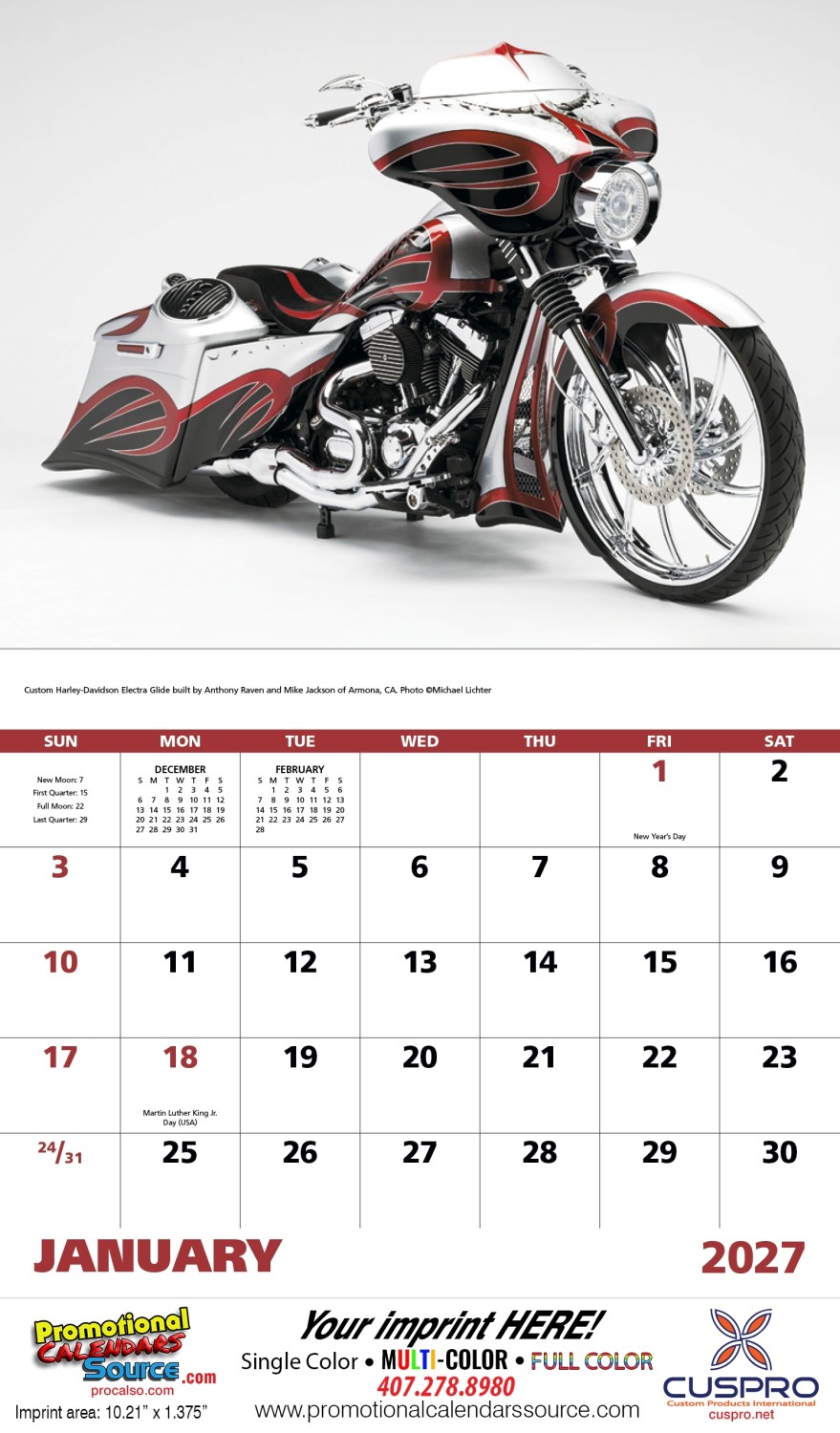 For the Custom Motorcycles lovers, this is a perfect calendar to display all year round. Filled with images of custom bykes with lots of chrome, custom paint jobs and creative attitude, is perfect for advertising your business and promote your services.