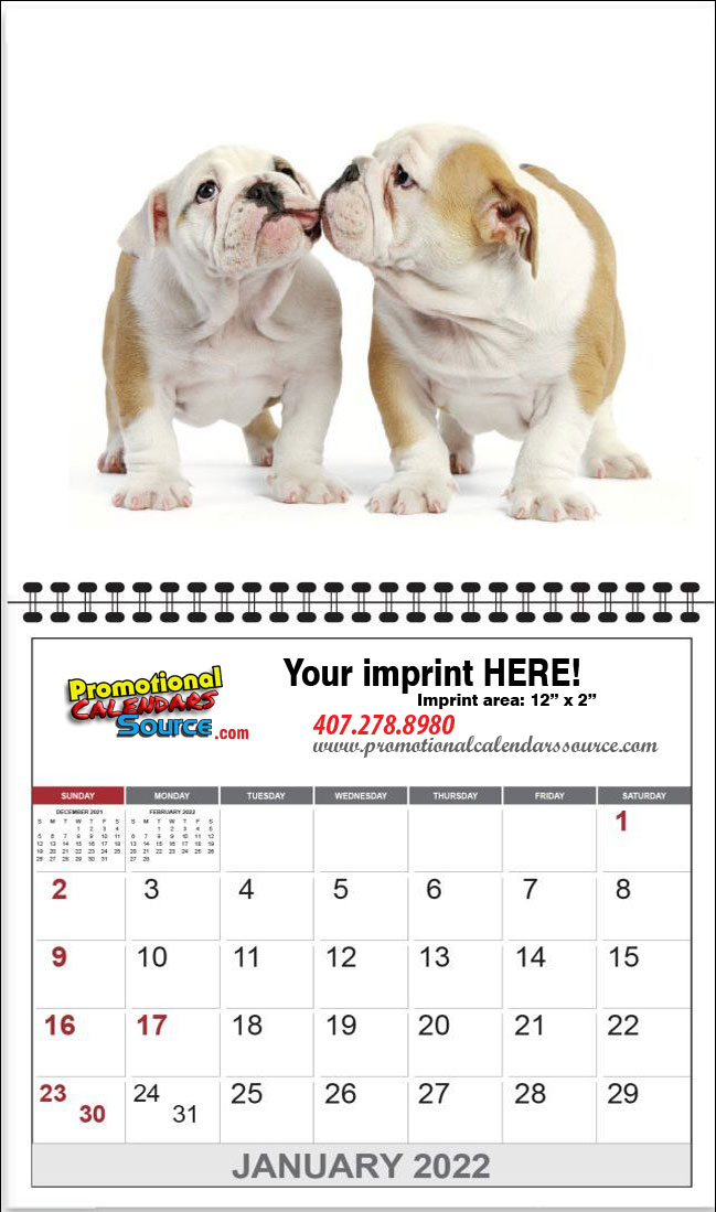 Puppies Promotional Wall Calendar, a great quality product made with heavy stock. A spiral wall calendar filled with beautiful images of cute little puppies to be admired all year alongside your advertising copy. Perfect for any business and animal lovers.
