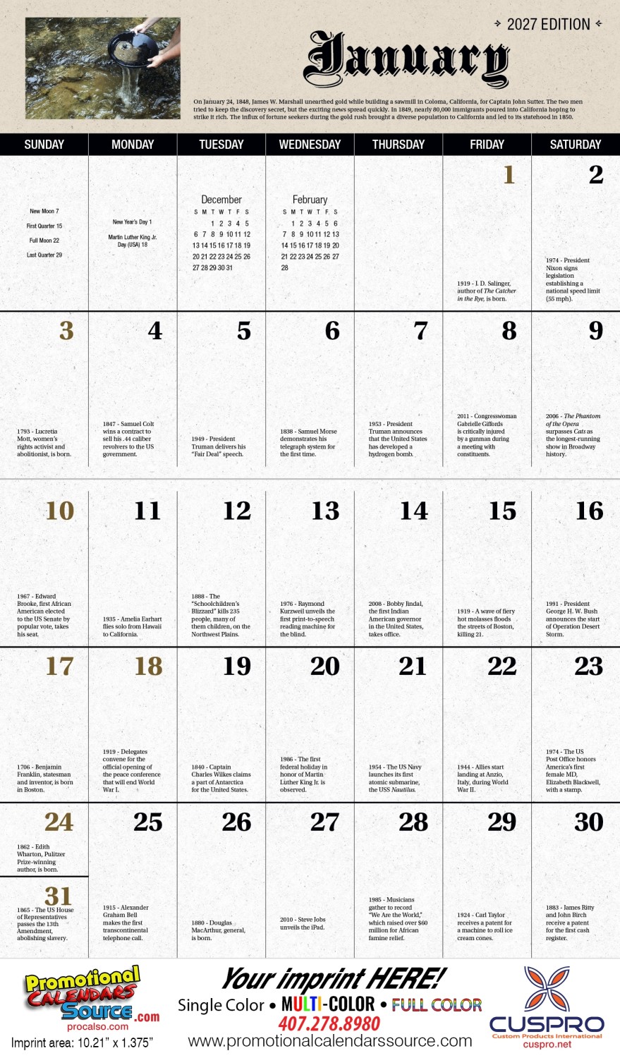 Daily American History Facts Calendar with Stapled binding for a perfect fit. This calendar displays on each date block, facts of American History. Perfect for advertising your business & services and for an artful and cultural connection to your audience.