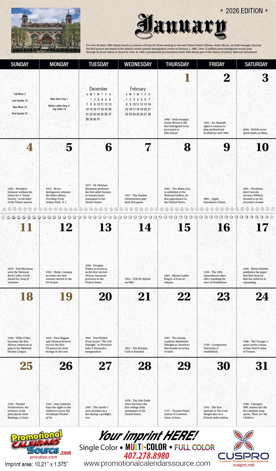 Daily American History Facts Calendar with Spiral binding for a perfect fit. This calendar displays on each date block, facts of American History. Perfect for advertising your business & services and for an artful and cultural connection to your audience.