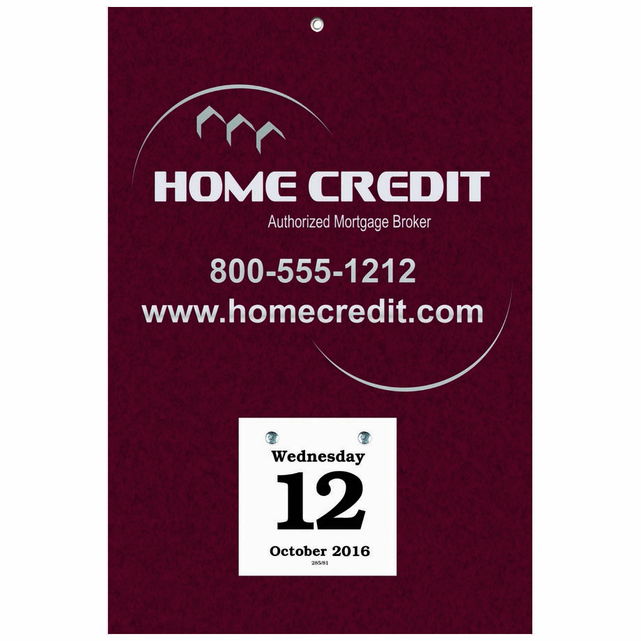 Daily Date Calendar with large backboard measuring 8-3/8” x 12-3/8” and with 3” x 3” refillable date pad. Also available with 4-1/4” x 4-3/4 or 6” x 5-1/2” date pad. Bookbound Daily Dates are our standard calendars. Custom printed with 1-4 colors. Calendar pad begins in mid-December for early distribution and assured wall space.