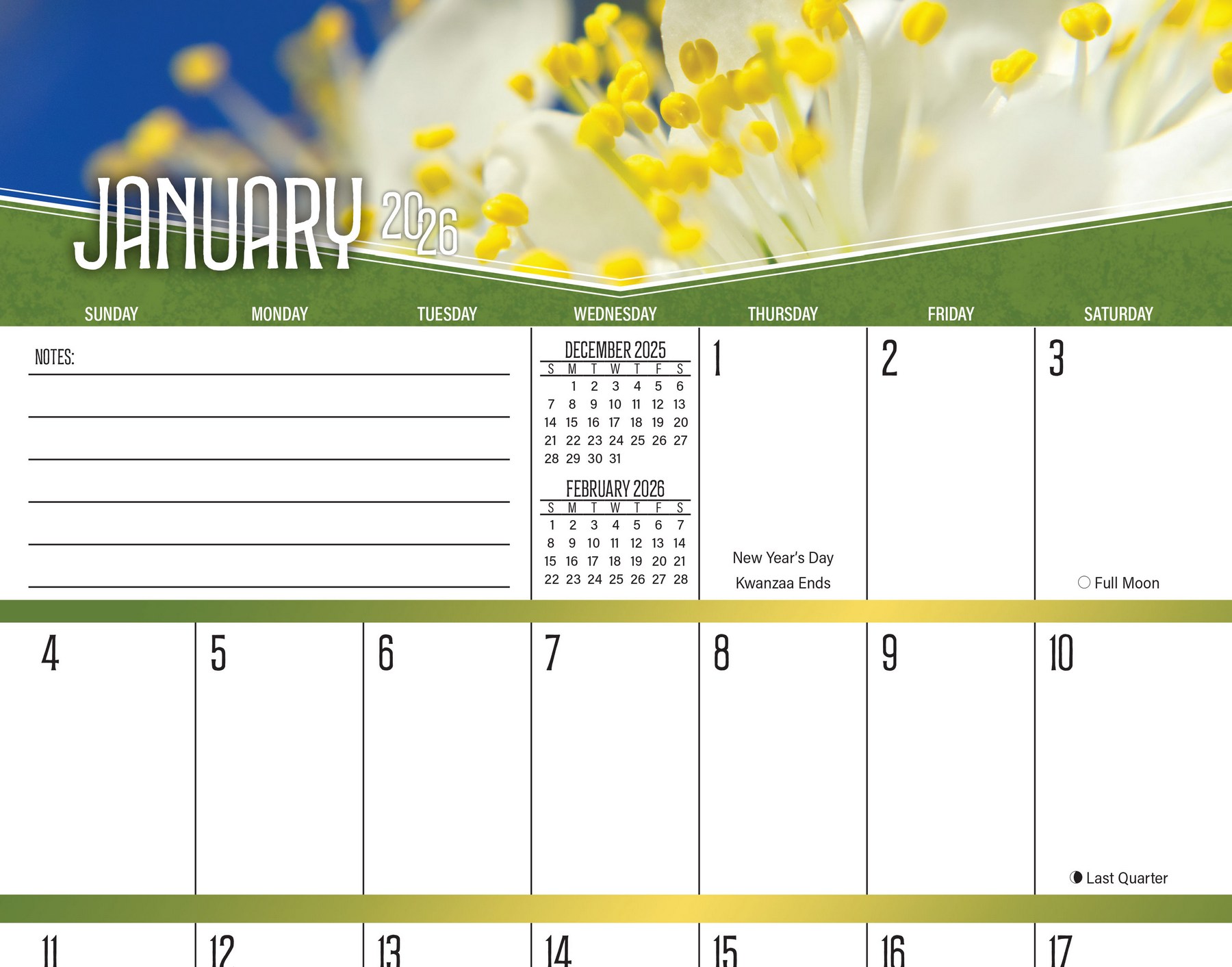 The Day By Day is a general calendar featuring scenic photographs for each month, as well as extra-large daily boxes (1 1/2"x 2 3/8") for noting appointments. Decorated with beatiful scenic images on the top, will be a useful and pleasing calendar to cherish year round. Inside back cover section includes a full 2027 calendar and a practical large area for additional notes. FUNERAL PREPLANNING INSERT Saddle Stitched Calendar Option: AVAILABLE IN ENGLISH or BILINGUAL (English/Spanish) Features two detachable response cards, one shown in the beginning of the year and one at the end of the year. Funeral Home return address will be printed on the face of response card. Personal contactinfo on inside of folded mailer for security. See pricing inthe Other Charges tab.