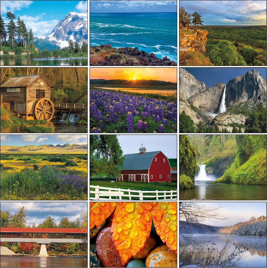 This Large Decorator Memo Calendar, Item No. 6107, is same as item 6106 except that all pages have a White background, large date blocks and scenic images. The grids are pre-printed in Black.