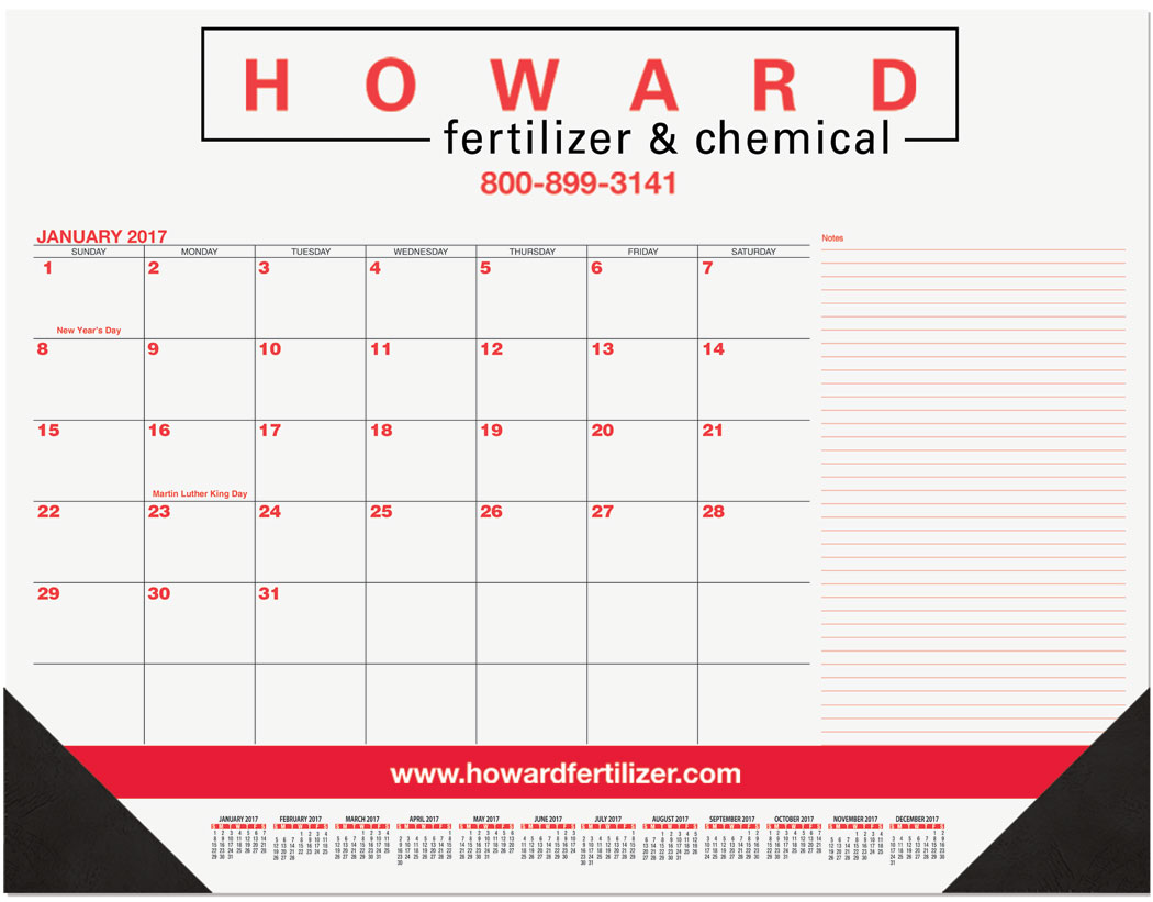 A 13-month Desk Pad Calendar with Months, dates, and larger bottom reference calendar preprinted in Red and Black on 60 lb. white offset paper. Padded at top with 13 sheets to a pad, chipboard back and two corners at bottom of pad. Large 12 month reference calendar standard at bottom of each layout with company logo and information printed in designated imprint areas in one standard color.