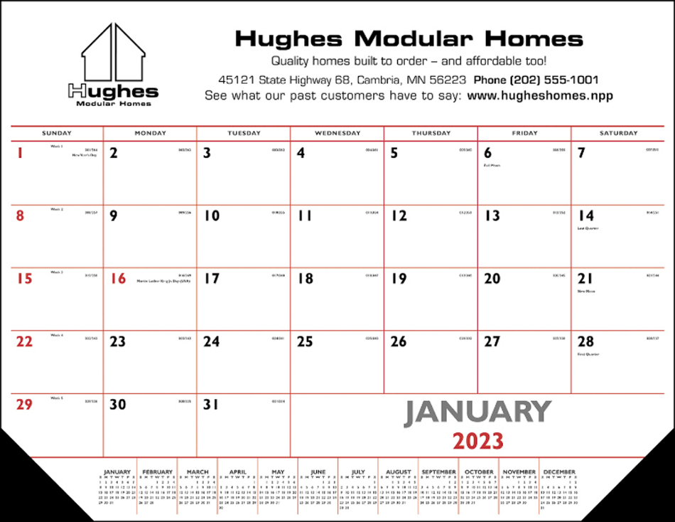 Desk Pad Calendar w Vinyl Corners Red & Black imprint. Calendar grid pre-printed in Red and Black. Product size is 22x17 in., Ad copy area 22x 2.75 in. can be printed with one or more colors. Full color imprint available. Desk pads keep a customer s name in front of potential clients on a daily basis. Vinyl corners provide an attractive frame and durability.