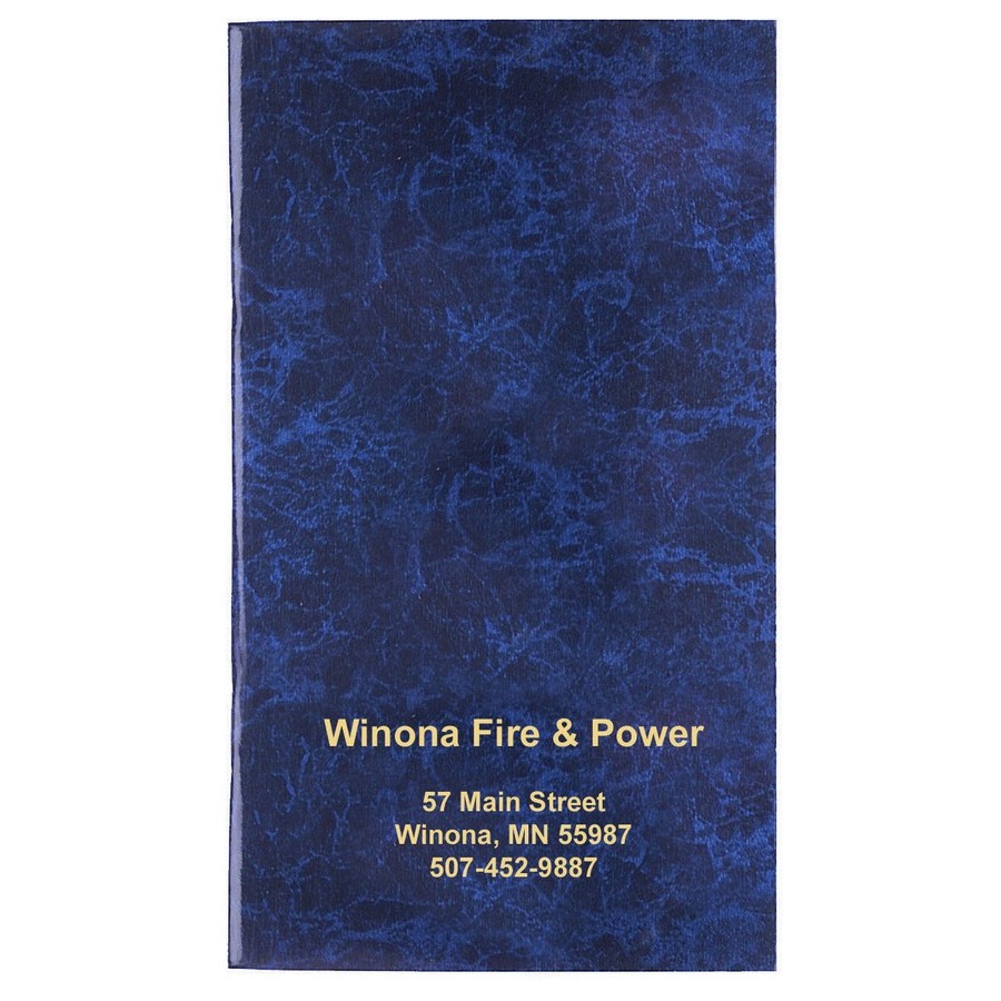 Promotional Monthly Pocket Planner Marble Finish. Pocket planner with 12 pt. laminated cover, stitched into a heavy, "marble-look" paper cover. Perfect for book stores, banks & gyms. Best seller! Work monthly. Four cover colors available: Burgundy, Royal Blue, Green, Charcoal Gray.