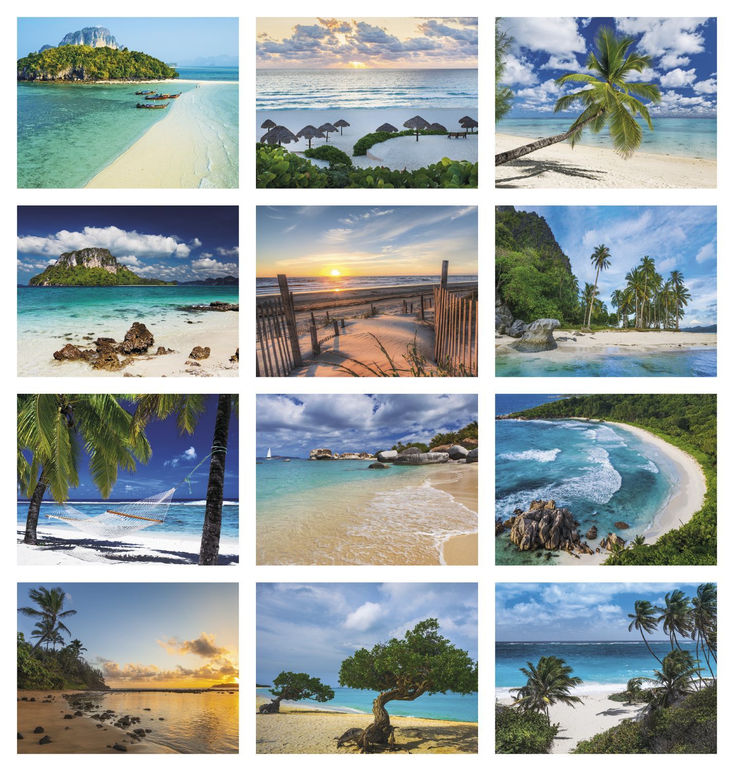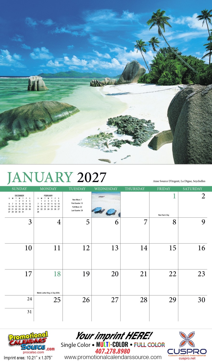 Fabulous Beaches Wall Calendar with Staple binding. Personalized with your custom imprint. Escape to these sunny exotic beaches and relax. Escape to lands of natural beauty with this display of ocean side scenic views. Features thirteen breathtaking images of picturesque vistas of beaches from across this great world. Custom printed with your information will provide year long advertising.