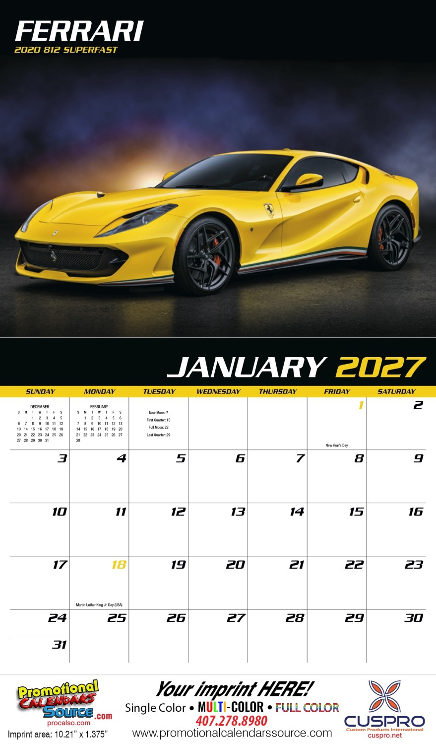 Fast Trax Promotional Calendar Stapled. Keep your focus on these sizzling cars but be quick, because they ll be gone in a blink of the eye. This calendar features thirteen of the fastest and hottest cars you ll find anywhere. Custom printed with your information will provide year long advertising.