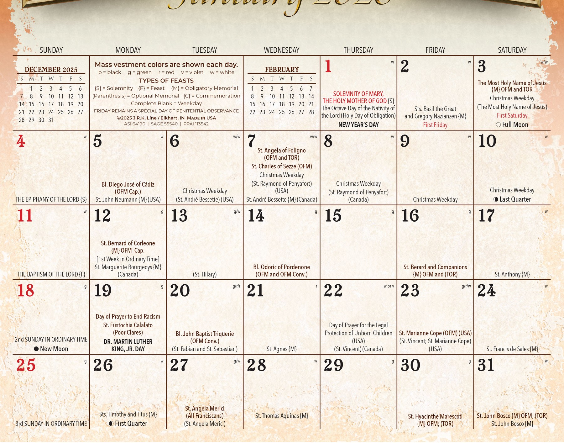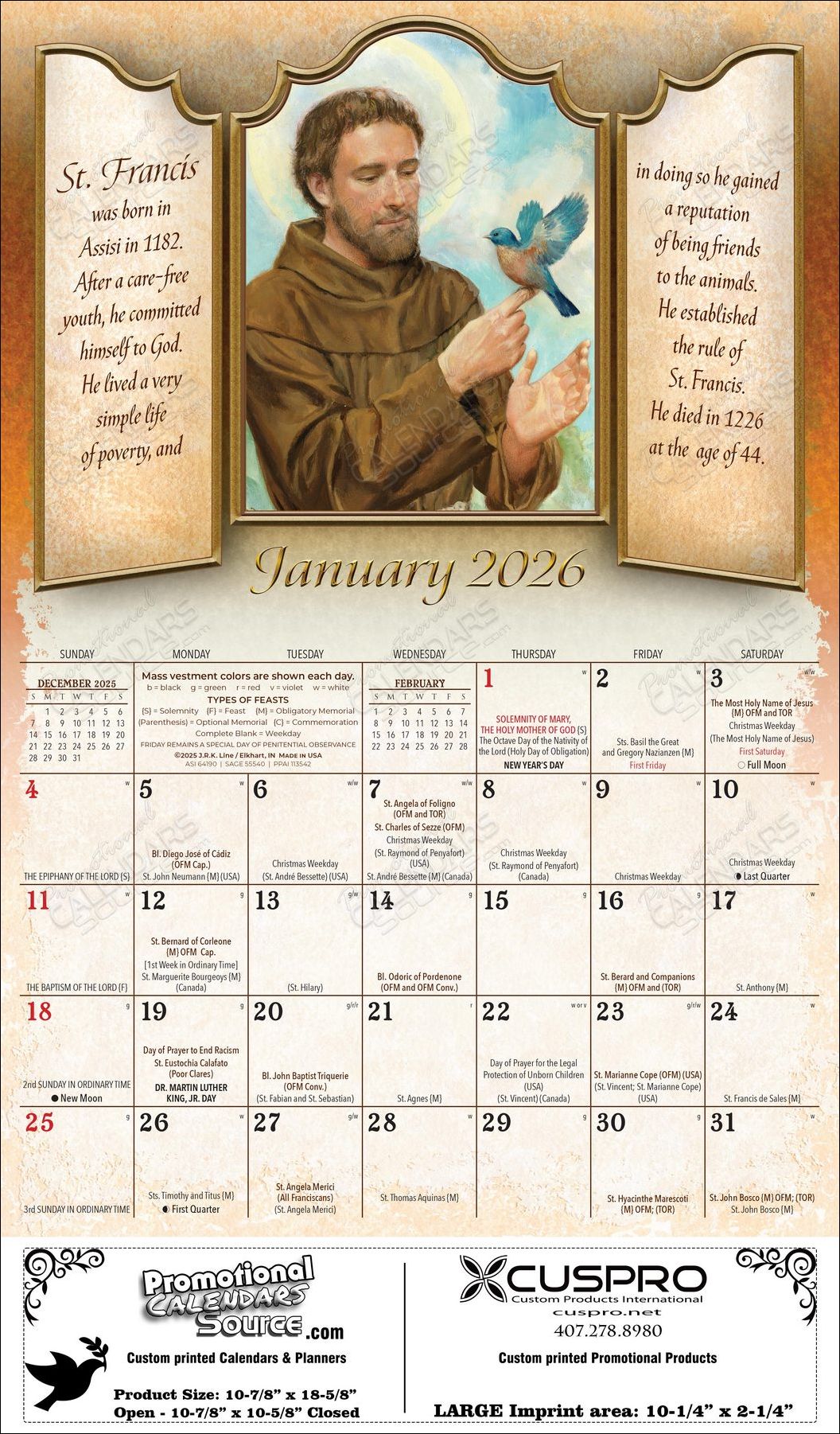 Franciscan Art Calendar Catholic Calendar with Funeral Preplanning insert option