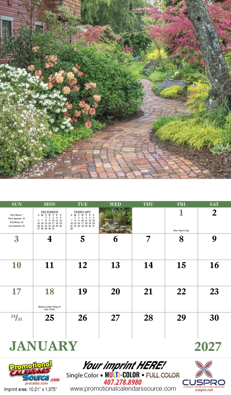 Eye-catching garden images 13-month a year. Colorful Gardens promo calendar with stitched binding for your promotions. Relaxing and colorfull images adding color to daily lives.