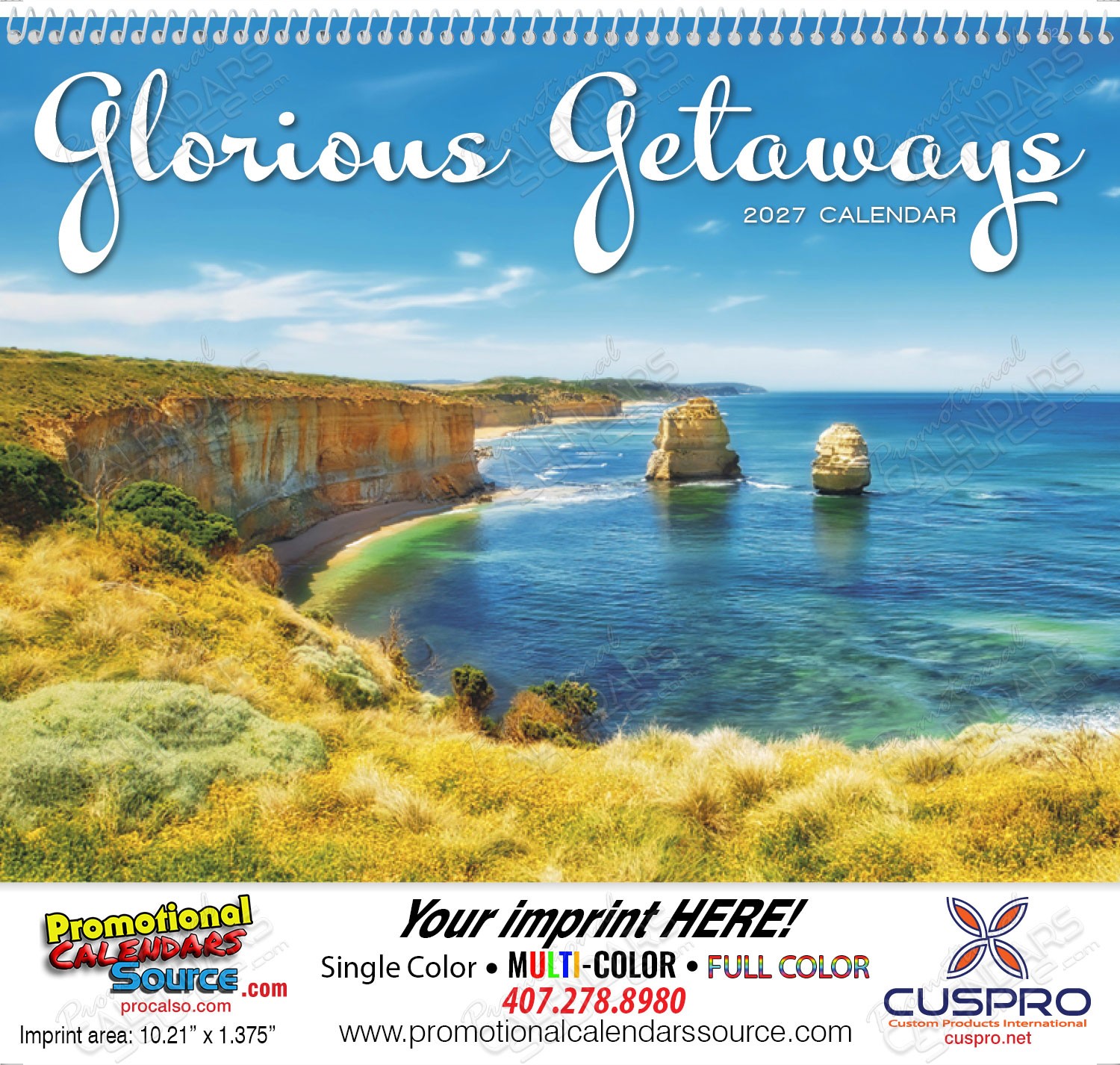 2027 Glorious Getaways Promotional Calendar – Stunning Travel Destinations, Custom Printed, Spiral Binding, Perfect for Promotions & Gifting