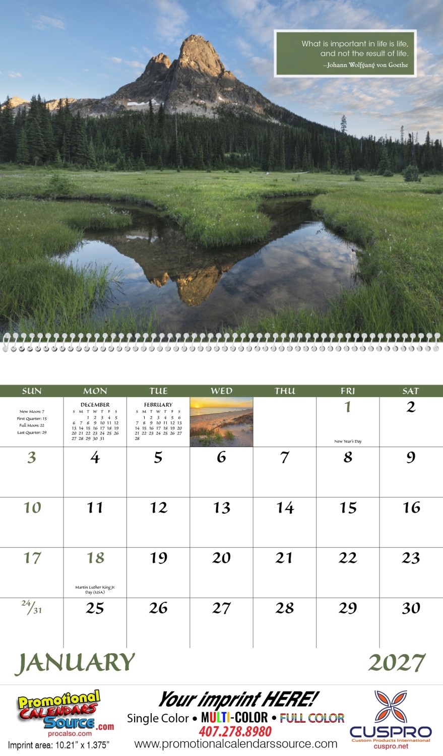 Inspirations for Life wall promo calendar with spectacular scenes and inspiring quotes to support your message. Size open 11" x 19" this calendar will inspire more business.