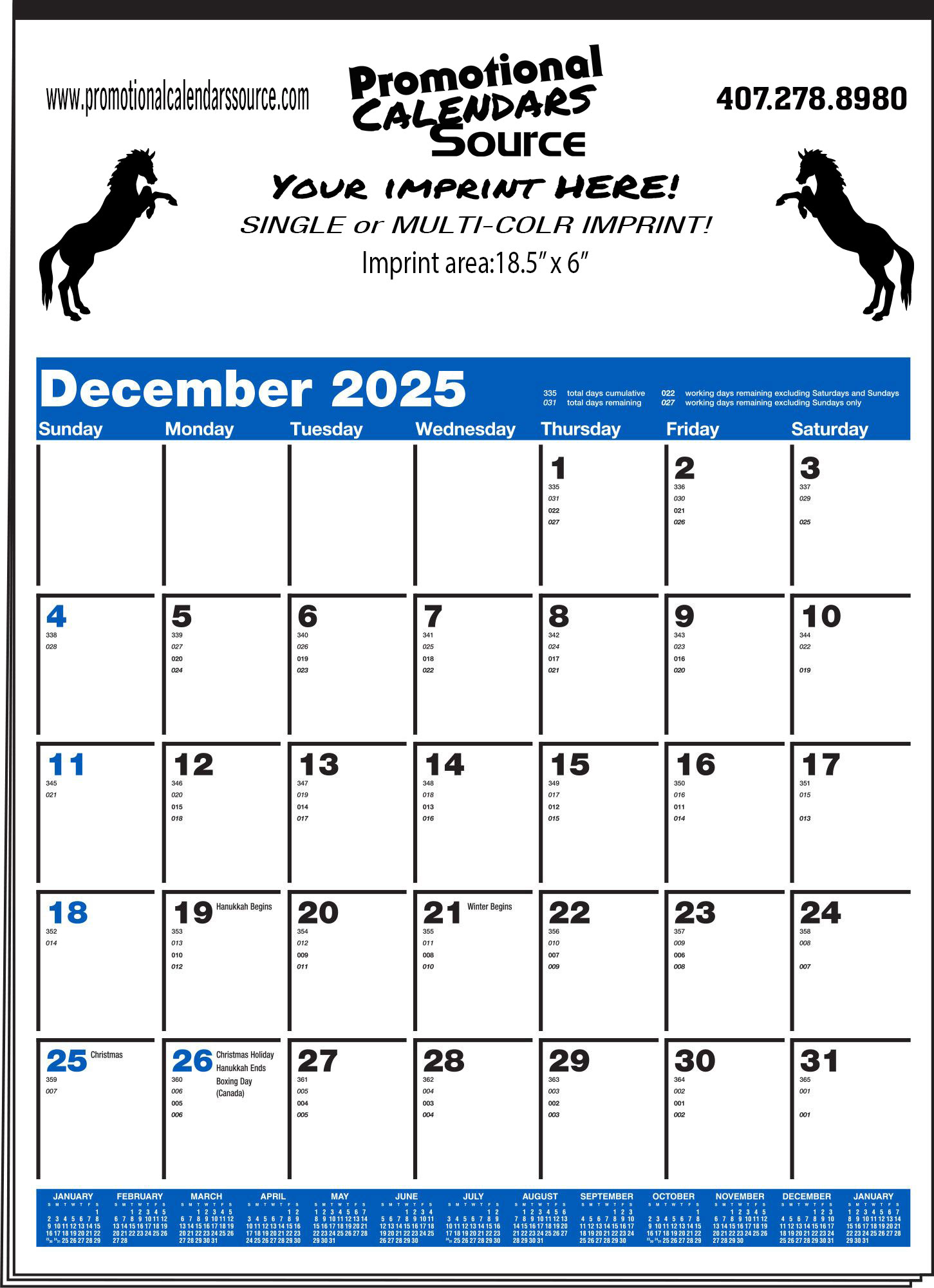 This Large size Contractor Calendar comes with a stock pad design pre-printed in Black & Blue and includes the December top sheet (13-months - 13-sheets). Size is 19.5" x 27" with a customizable area of 18.5" x 6" for your imprint.