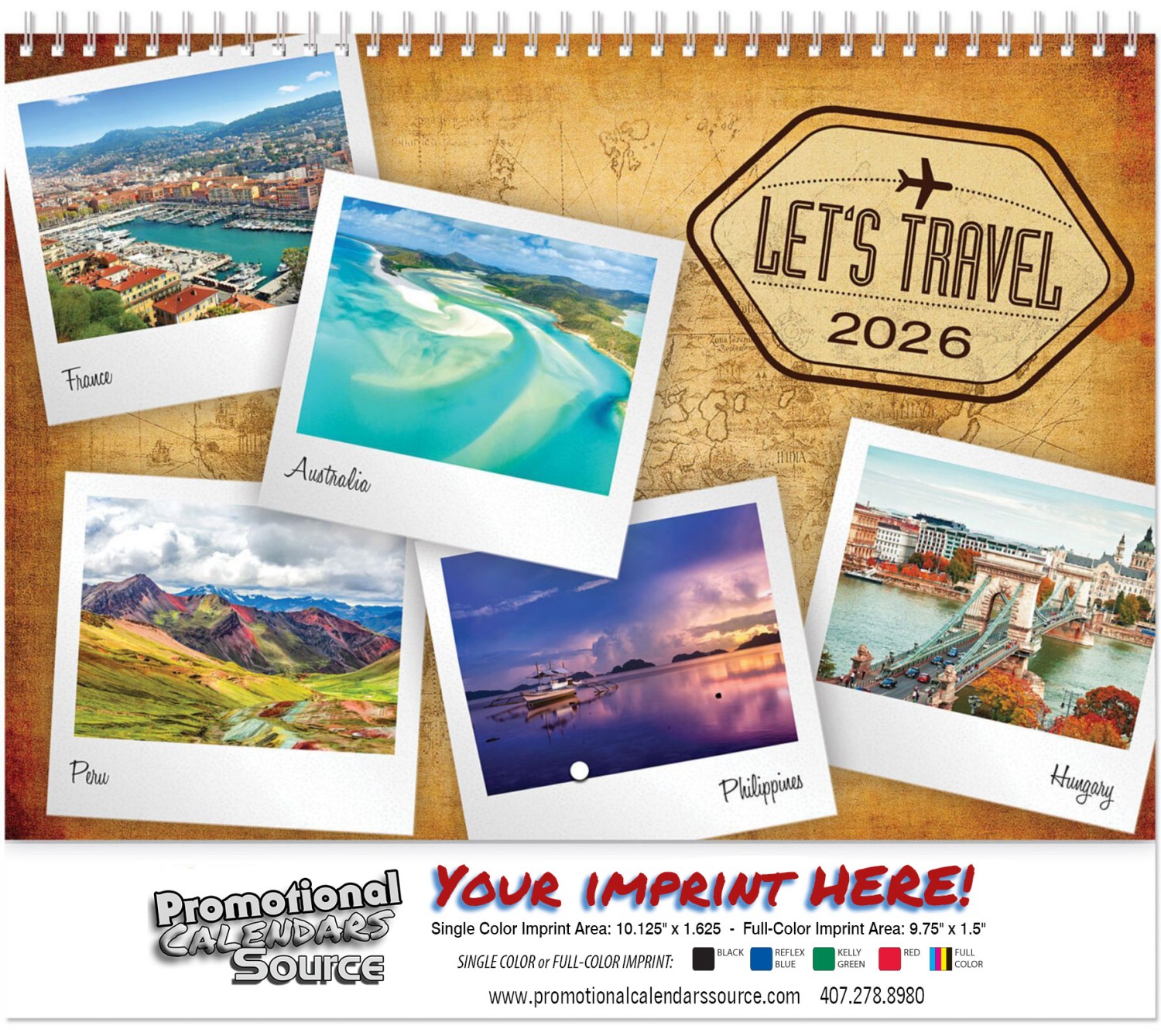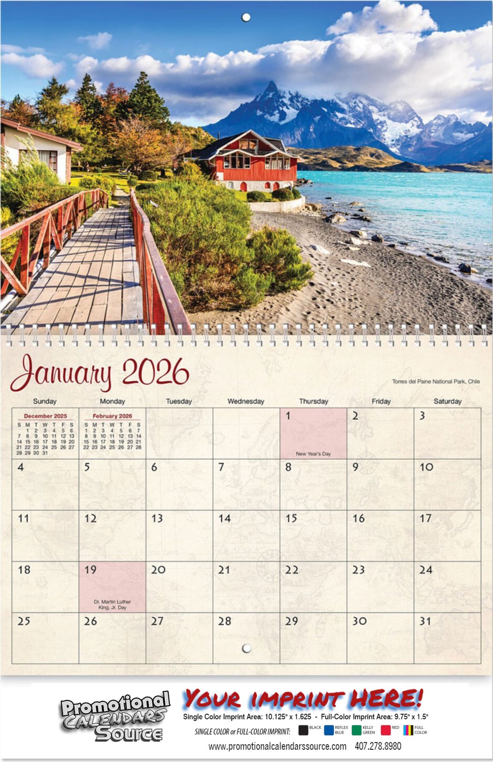 Your customers can enjoy places from around the world while looking at the colorful images of this promo calendar. Your advertising message enjoyed all year long. Stitched Wall Calendar with Your ad copy custom printed on the back flap.