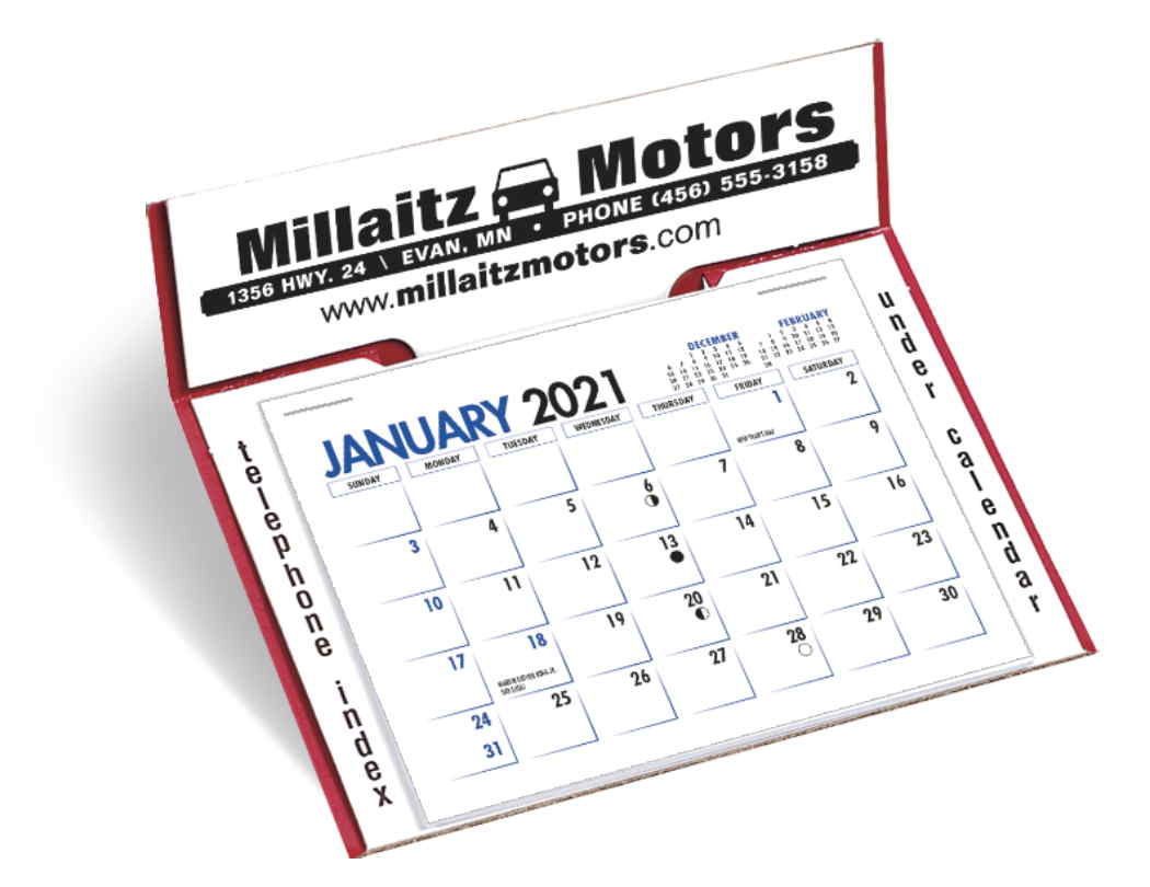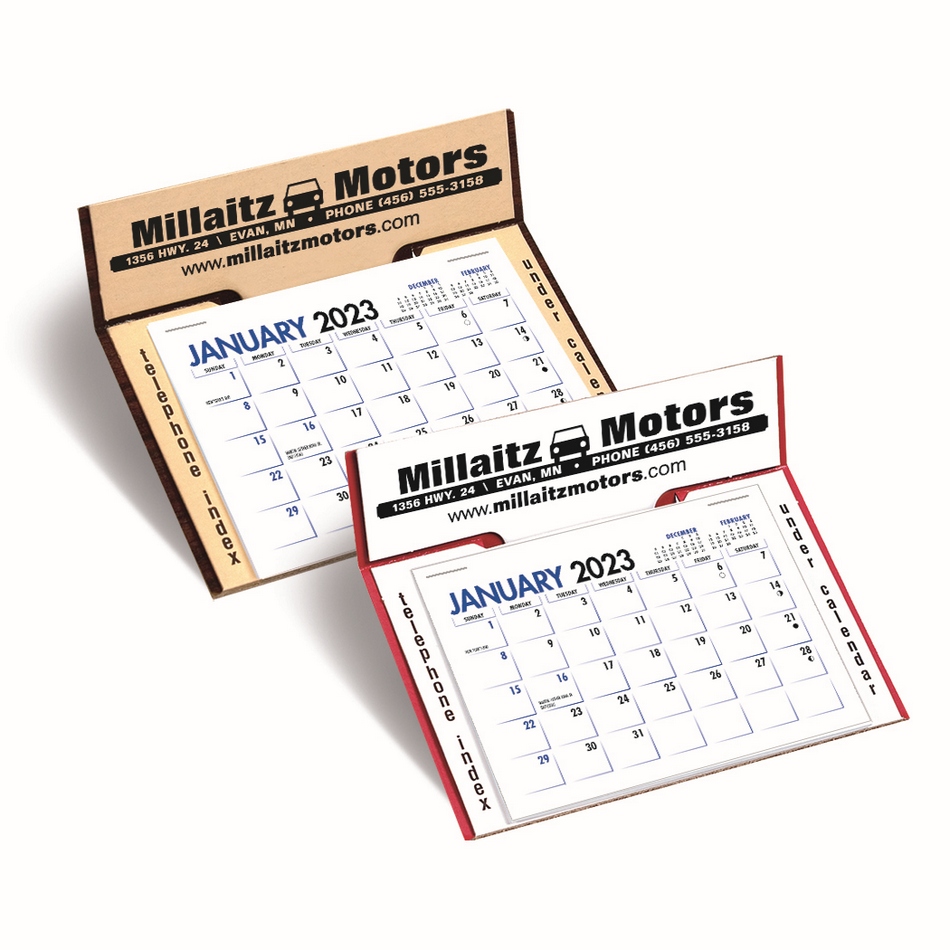Memo Promotional Easel Desk Calendar. This Memo desk calendar offers convenient size and an advertising message that is boldly displayed at the top of the calendar. It offers outstanding value and ad visibility. Available mount colors: White-Red, Tan-Woodgrain. Contact us with your design needs so we can assist you finalize the details of your calendar.