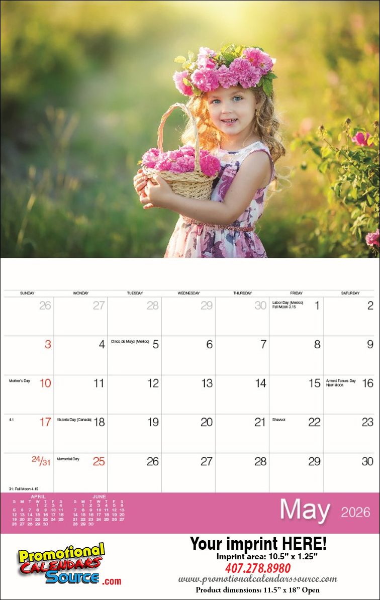 Kids Calendar 2023 - Stapled. Images of little bundles of joy, beloved kids & toddlers decorate this 12 month calendar of great quality. Custom printed with your business information and logo for a year long exposure will be a great and appreciated gift for all your cuastomers. Great for any business dealing with kids, from daycare to doctors, clothing stores to clinics. Certain to be appreciated.