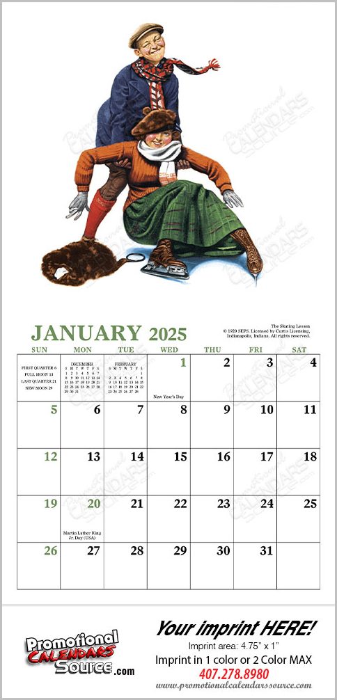 Norman Rockwell Mini Wall Calendar . Good things come in small packages, just like this Norman Rockwell calendar. Bring a little Americana everywhere you go with these classic Rockwell illustrations featuring young lovers, elderly companions, and everyone in between. Custom printed with your advetising copy in the 6"x1-1/8" imprint area, will promote your business all year long. Contact us with your design needs so we can assist you finalize the details of your calendar.