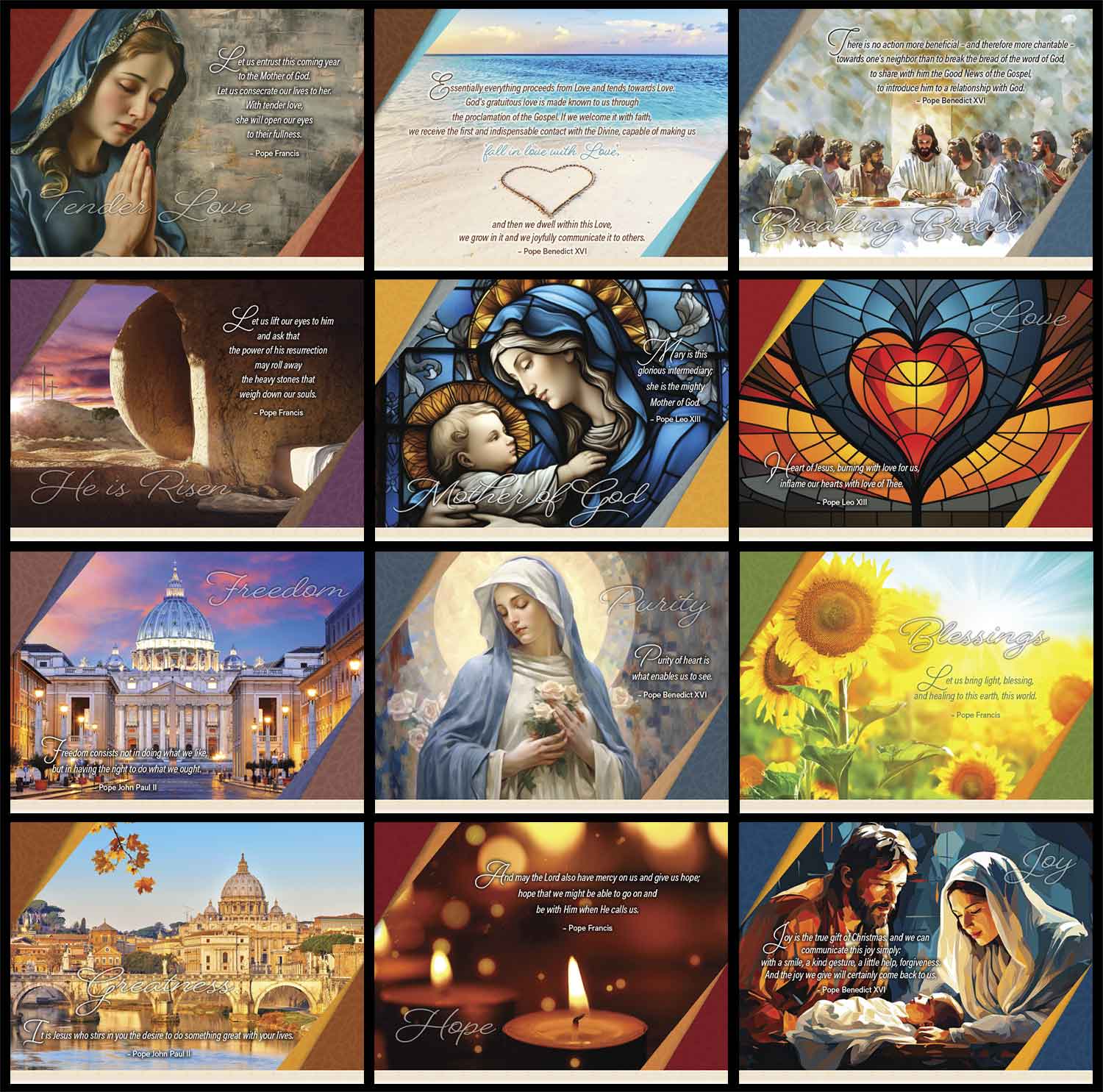 Over time various Popes have said inspiring words about our Catholic teachings. This calendar captures these words from the Holy Fathers. These words from the various Popes are inspiring and uplifting. The calendar offers complete Catholic information regarding Saint’s Days, vestment colors, and other information regarding Catholic obligations. Holy Days of Obbligation for 2023 with other Useful reference info and full 2024 calendar on back spread.