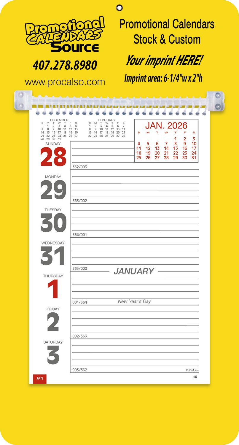 Promotional Big Numbers Weekly Memo Calendar - Yellow. This handy model has a sturdy mount board with a hanging hole, features large, bold numbers along with ruled daily memo space. View a full week with insets of before, current and after months on every page. Optional easel back available. Yellow color mount.