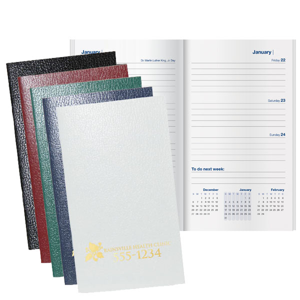 Promotional Weekly Pocket Pocket Planner - Coarse. Inexpensive monthly pocket planer light on the budget. Size 3.5" x 6" has plenty of room for your ad copy. Five cover colors available in textured finish: White, Black, Burgundy, Green, Navy.