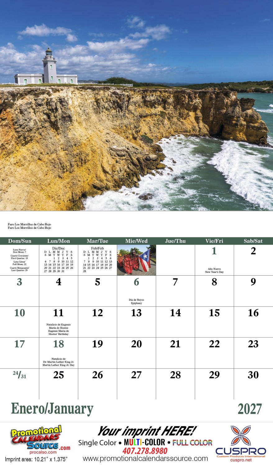 Puerto Rico Promo Calendar, Bilingual 13 month calendar, Made in USA, Puerto Rico bilingual calendar