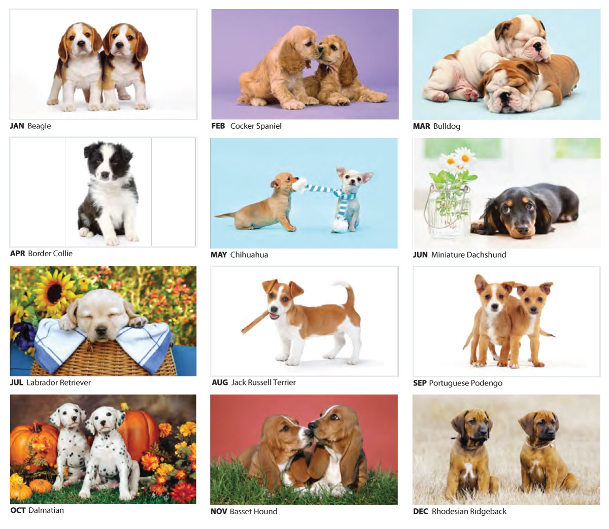 A promotional calendar for with beautiful images of cute caddly puppies to brighten your day.