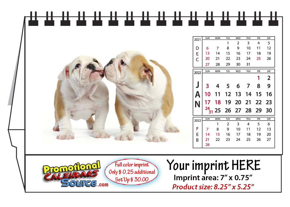Item JC-710 is a Tent Desk Calendar decorated with images of cute PUPPIES. Stand Construction made of 15 pt. Gloss Cover stock, and pages made of 8 pt. Gloss Cover stock.