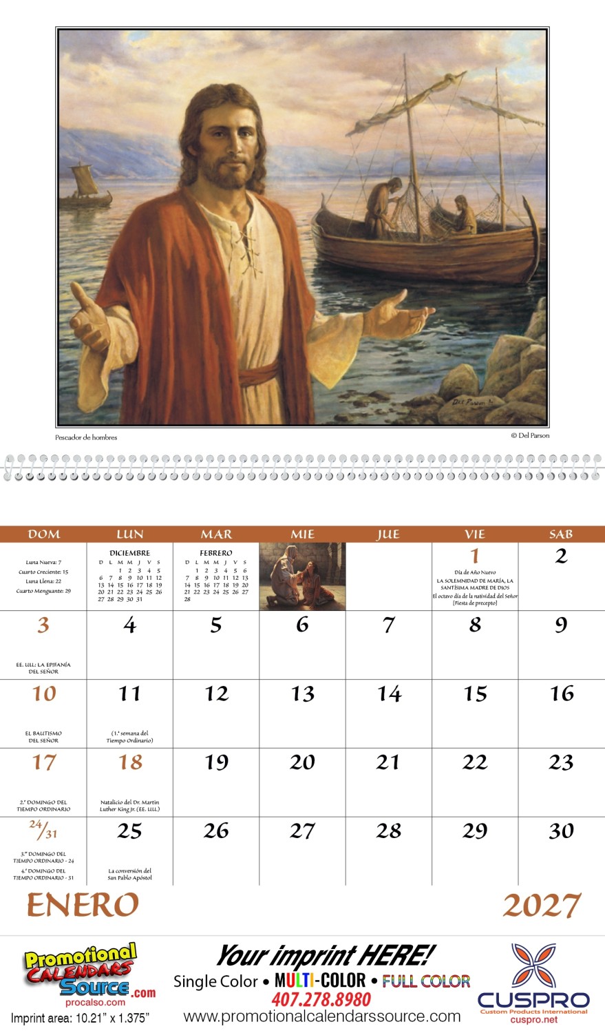 Regalo de Dios wo Funeral Pre-Planning Form Promotional Calendar Spanish. Great for advertisers with Spanish speaking customers. The grid includes Catholic observances.
