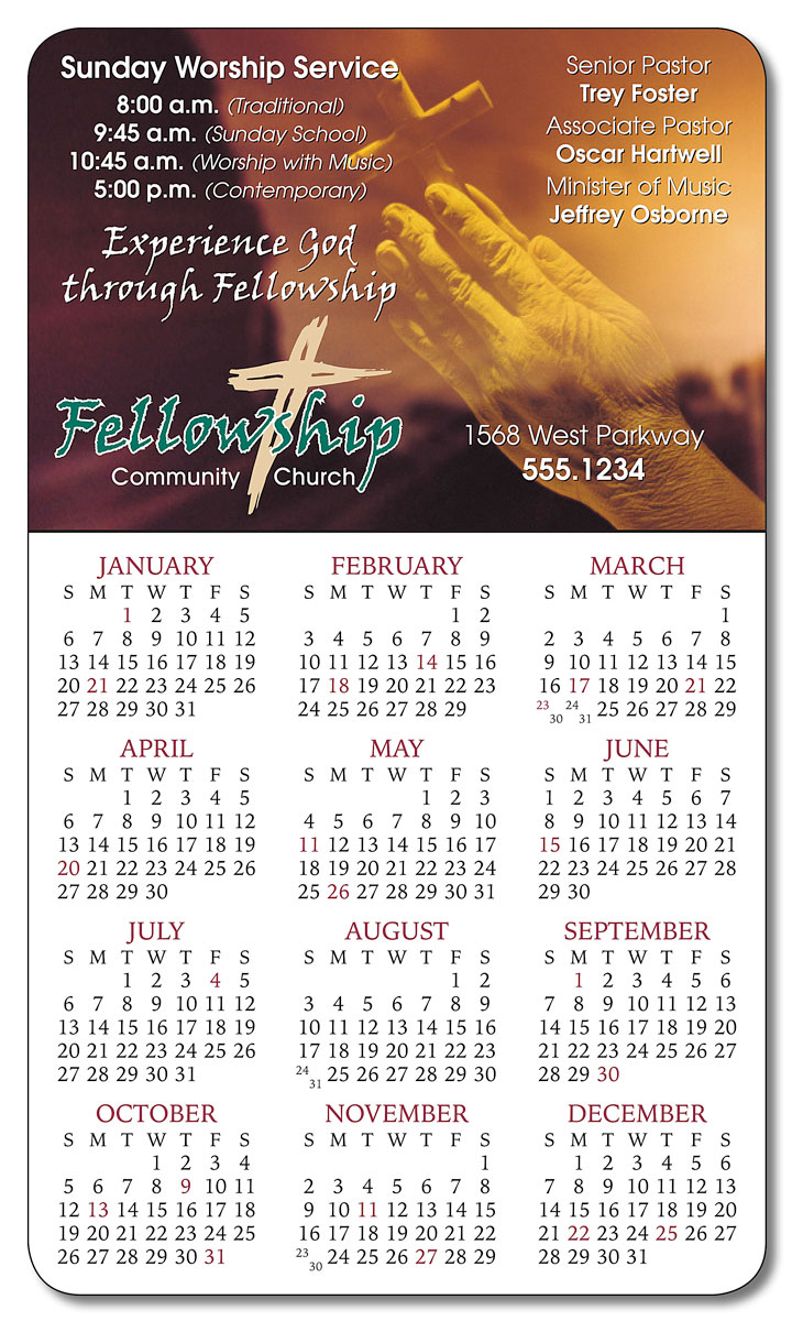 Religious Calendar Magnet 3.5x6 Round Corners - 25 mil. Need to inform your congregation of upcoming events or give them the information they need to attend services1/3 Rectangle shape magnets personalized with your photo and information, give your flock the information they need. Full-Color Magnets hang around in high-traffic areas and give a daily reminder. Full-Color Magnets stick to refrigerators, filing cabinets, appliances, vending machines, lockers and any other metal surface and will hold paper, pictures and more. Mail for the 1 ounce rate.