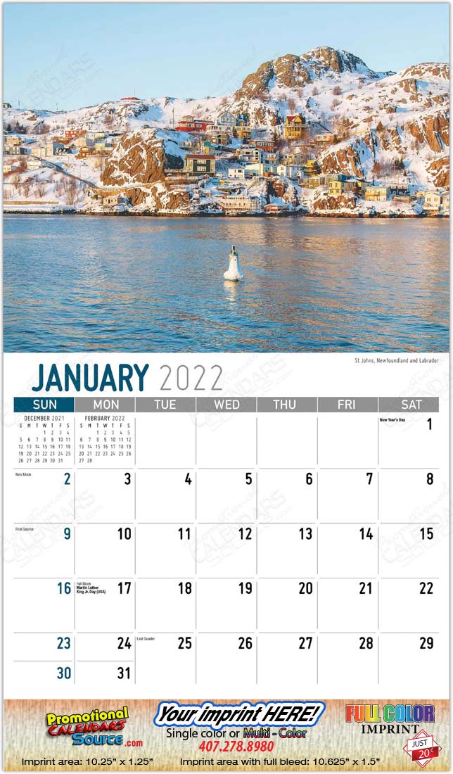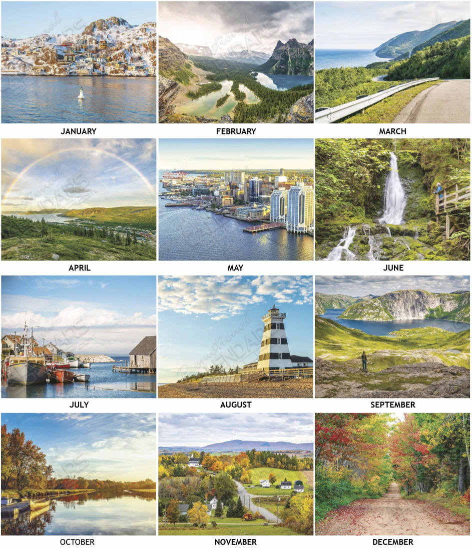 Scenes of Atlantic Canada Promotional Calendar showcasing the beauty of the Canadian Atlantic side. Images of of Newfoundland, Nova Scotia, Cape Spear lighthouse, Branders Pond Beach in Prince Edwards Island, and more will be admired all year round with your advertising message.