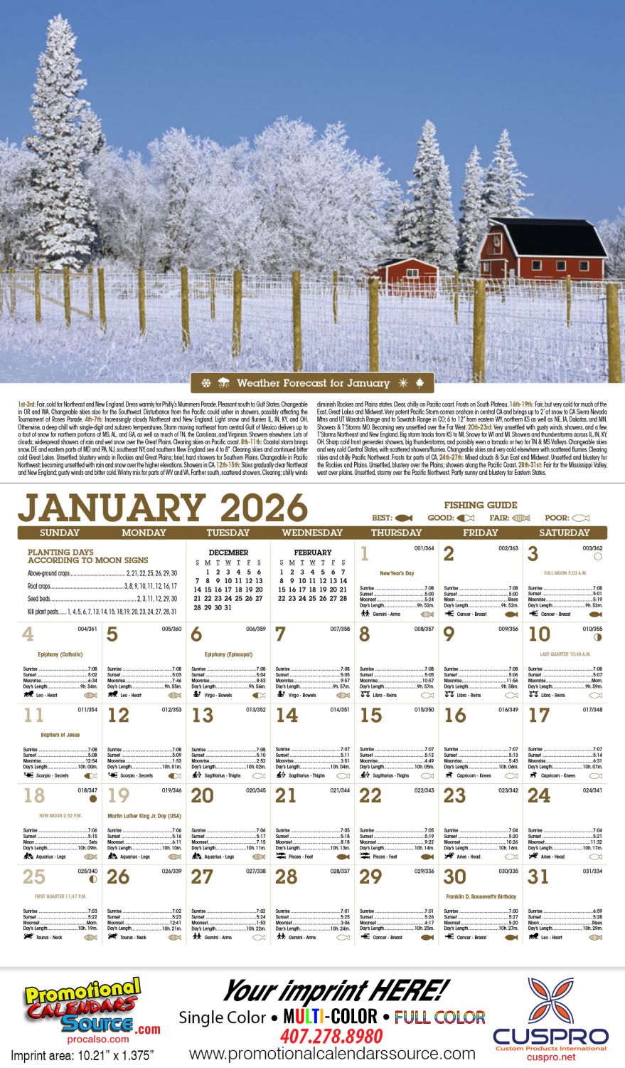 This superb weather watcher s calendar is filled with useful information such as weather forecasts, planting dates and prime fishing days. The almanac pad includes sunrise and sunset times, moon phases and times and much more.