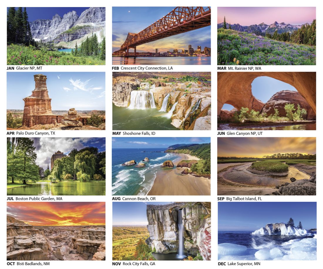 Our Item JC-902 is a large desk tent style calendar with dimensions of 9.5"x6-5/8". Pages are 8 pt. cover stock and the support is a sturdy 70 mill. Linen Finish stock. It is decorated with scenic images of US landscapes with a 3 month calendar on the front, and a large memo appointment style grid on the back. This is a great promotional calendar to keep your advertising on a desktop all year and as a quick reference for recepients.