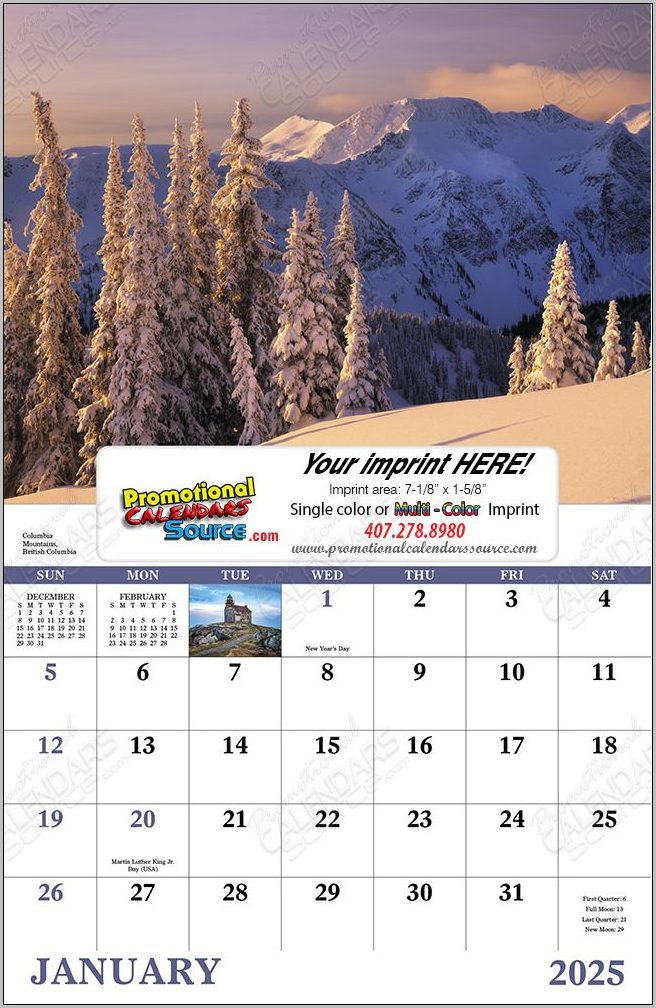 Scenic Canada Calendar with Window cutout for your custom imprint. The 13 captivating images of Canadian landscapes of all seasons will be appreciated all year alongside your advertising message. Ad copy can be printed in single or multi colo for additional impact. Great calendar to advertise your business.