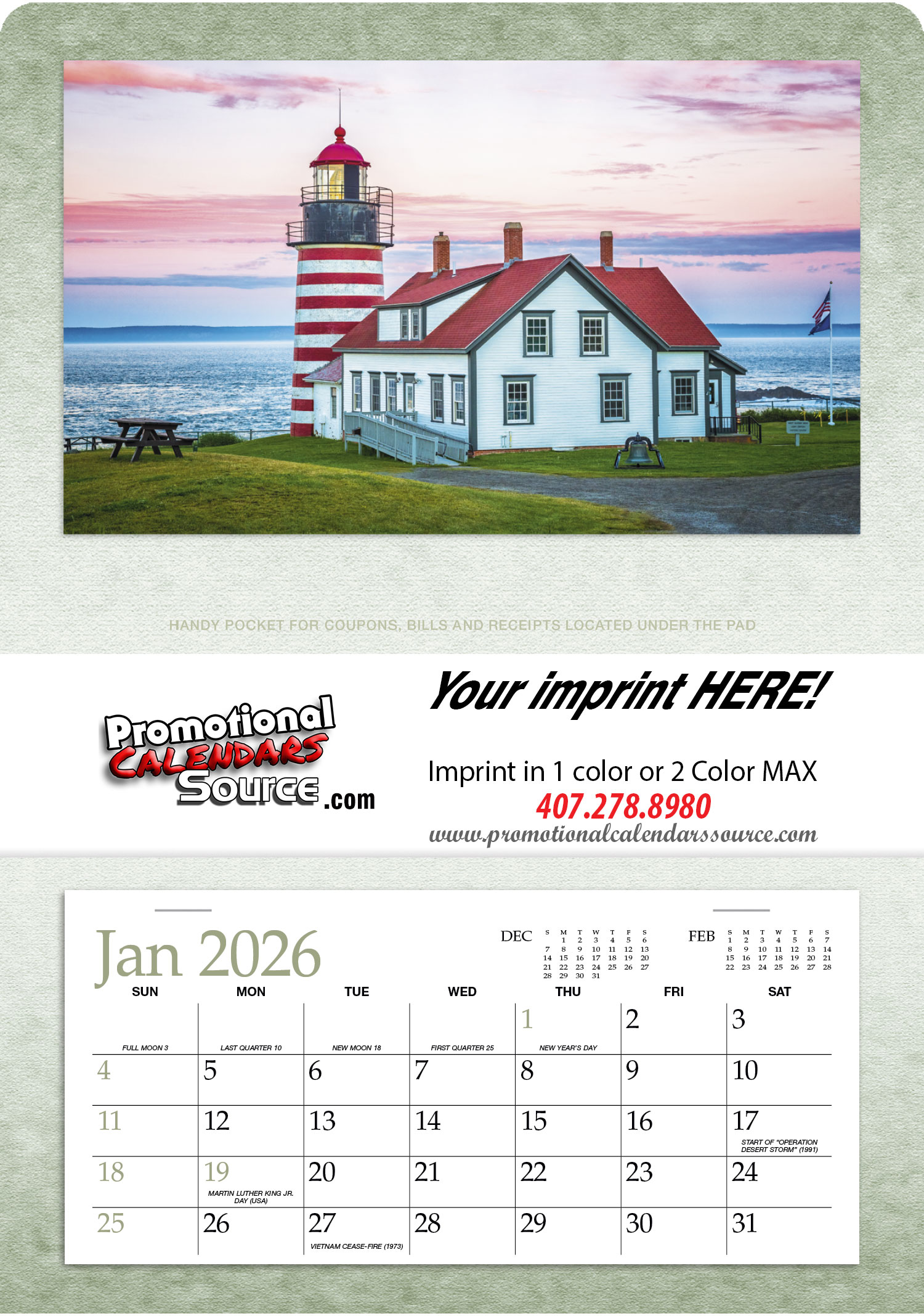 Great value and great versatility! This calendar folds for convenient distribution as a self-mailer and stores easily in a filing cabinet when the year is over. The single pocket is ideal for bills and memos.