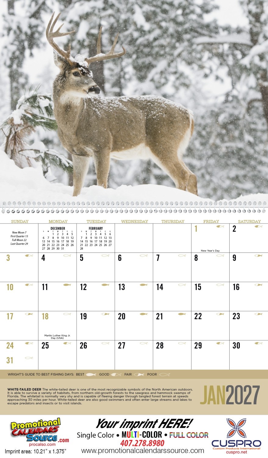 2026 Promotional Custom Printed Calendar - Add value to your calendar with an extra sheet and/or an Insights backmount for no additional cost - Specialized regional copy on the back of December covers KY, TN, NC, SC, MS, AL, GA, FL & AR - Includes Wright s Guide to the best fishing days - Optional Sticker Sheet Insert available; will be added between Dec and back cover - Top markets include: manufacturing, retail, construction