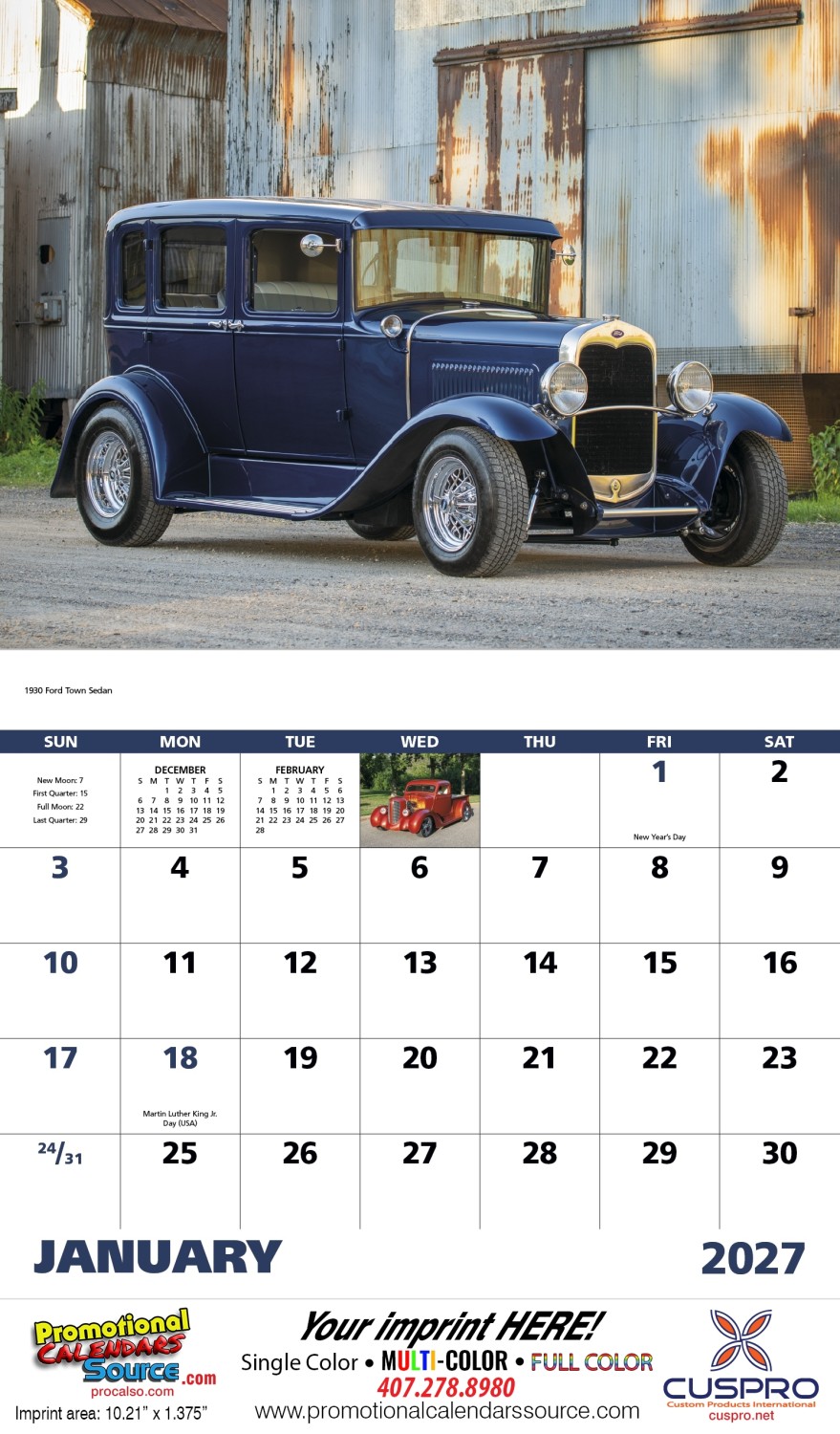 Street Rods Promotional Calendar Stapled, These rods will steal attention all year with roaring success. Drop ad customizable area, size 11x19 in open size.
