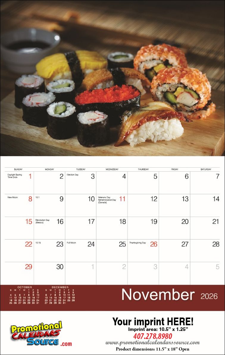 Sushi Oriental Cuisine Calendar 2023, size 11.5x18 with Staple Binding. For lovers of Sushi and Oriental Cuisine is a perfect advertising product. Colorful refreshing images decorate this appointment wall calendar, a 12 month calendar of great quality. The attractive and different desing, will certainly attract attention and be admired all year long, promoting your advertising message. Custom printed with your business information and logo for a year long exposure will be a great and appreciated gift.