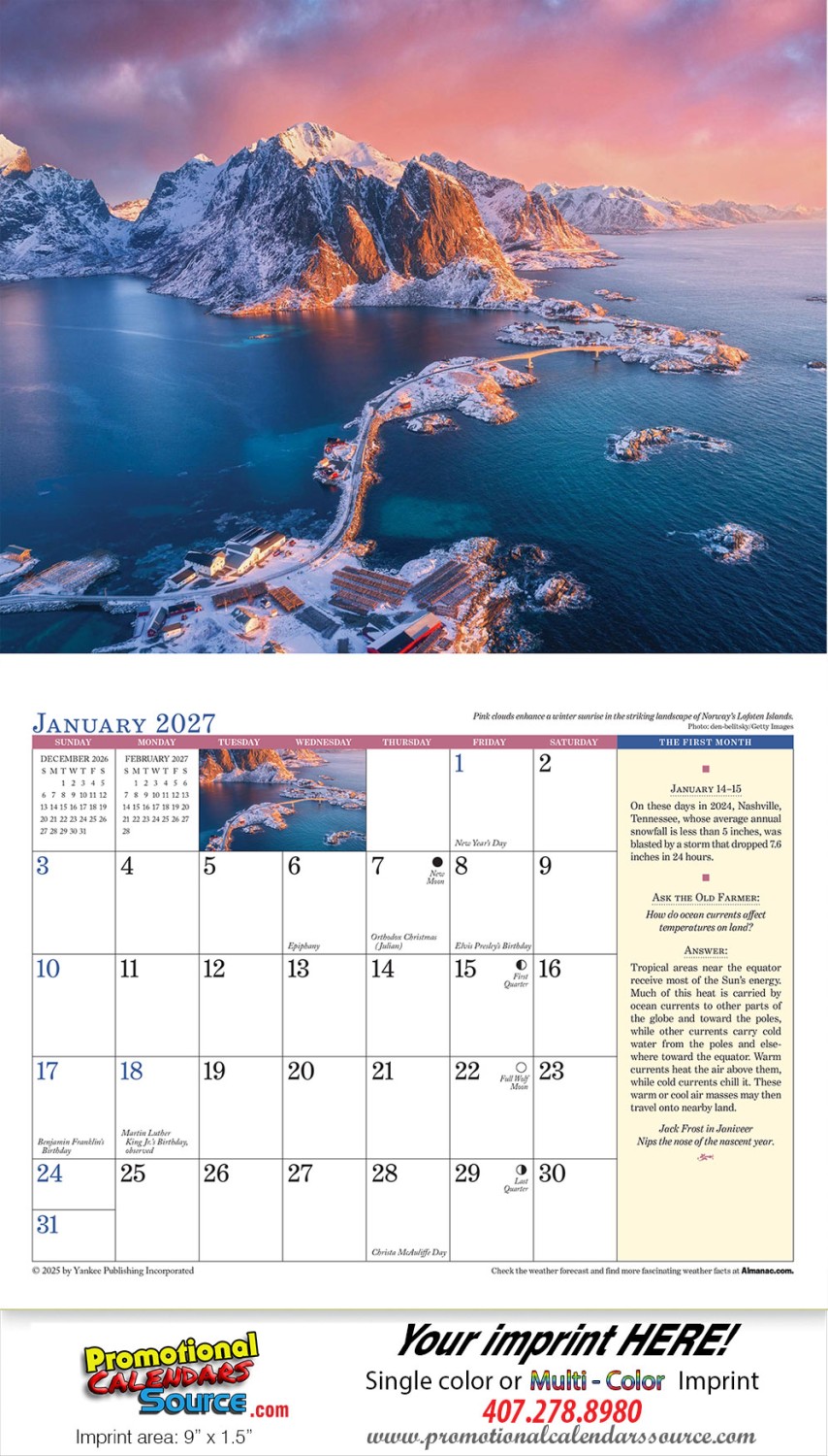 Stapled calendar, Made in USA, Landscapes Calendar, Outdoors, Nature promotional calendar, Natural Events customized calendar, Rain Winter Fog Nordern Lights Ice Windy Tranquillity,Custom printed Immagination calendar