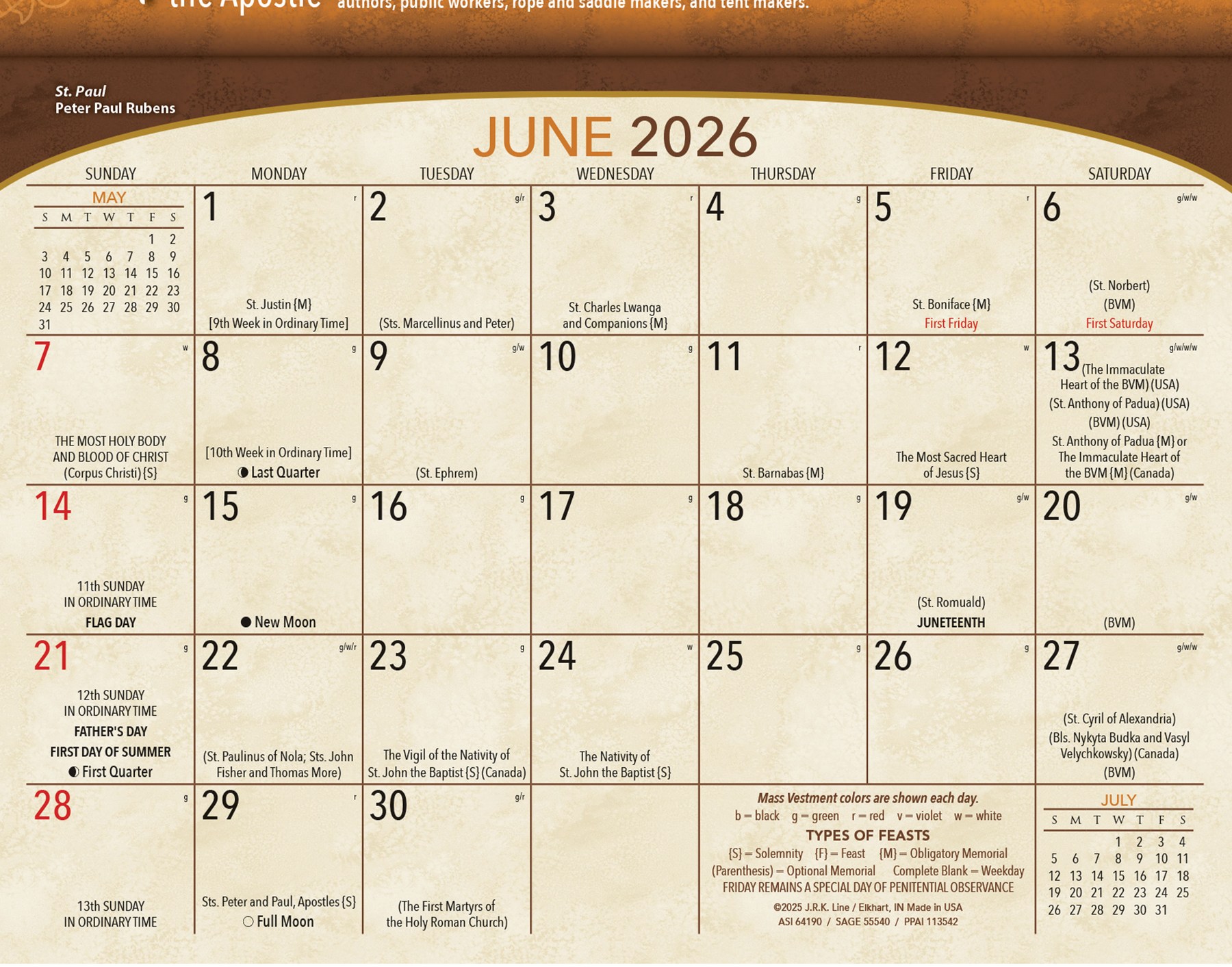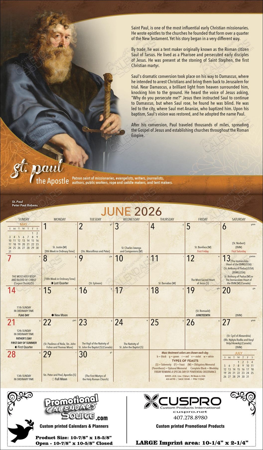 In the Catholic faith, many have devotions to the Saints. This calendar acts as an educational and inspirational tool. The calendar is designed with a large memo pad for listing appointments and contains all of the necessary information for carrying out Catholic obligations. Holy Days of Obbligation for 2023 with other Useful reference info and full 2024 calendar on back spread.